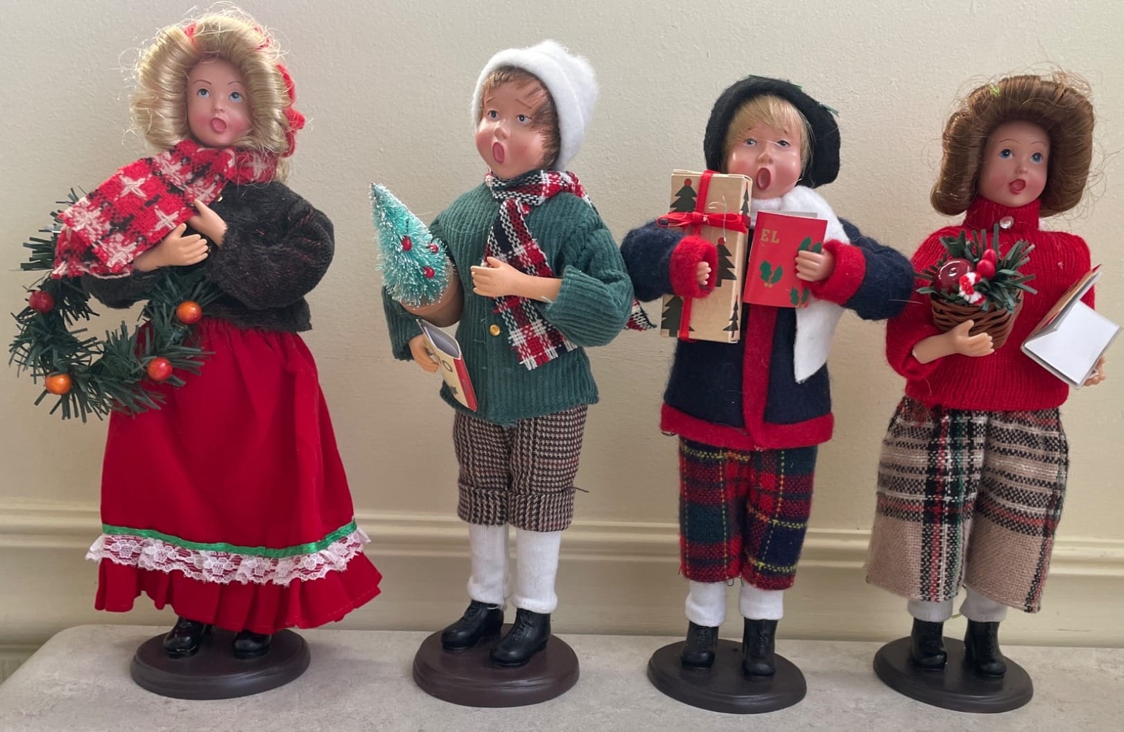 1013 4 Holiday Caroler Figurines on Dark Bases 9”