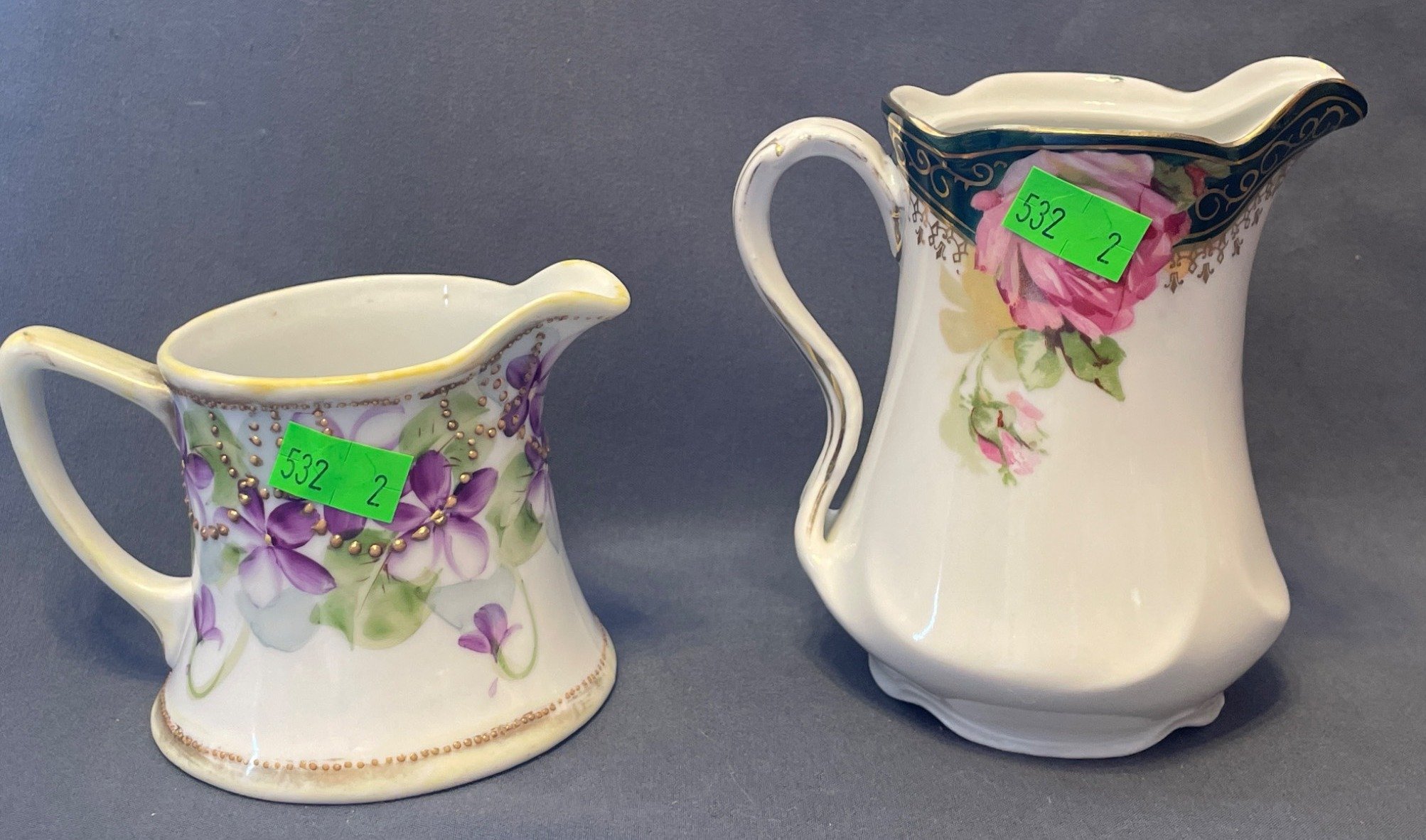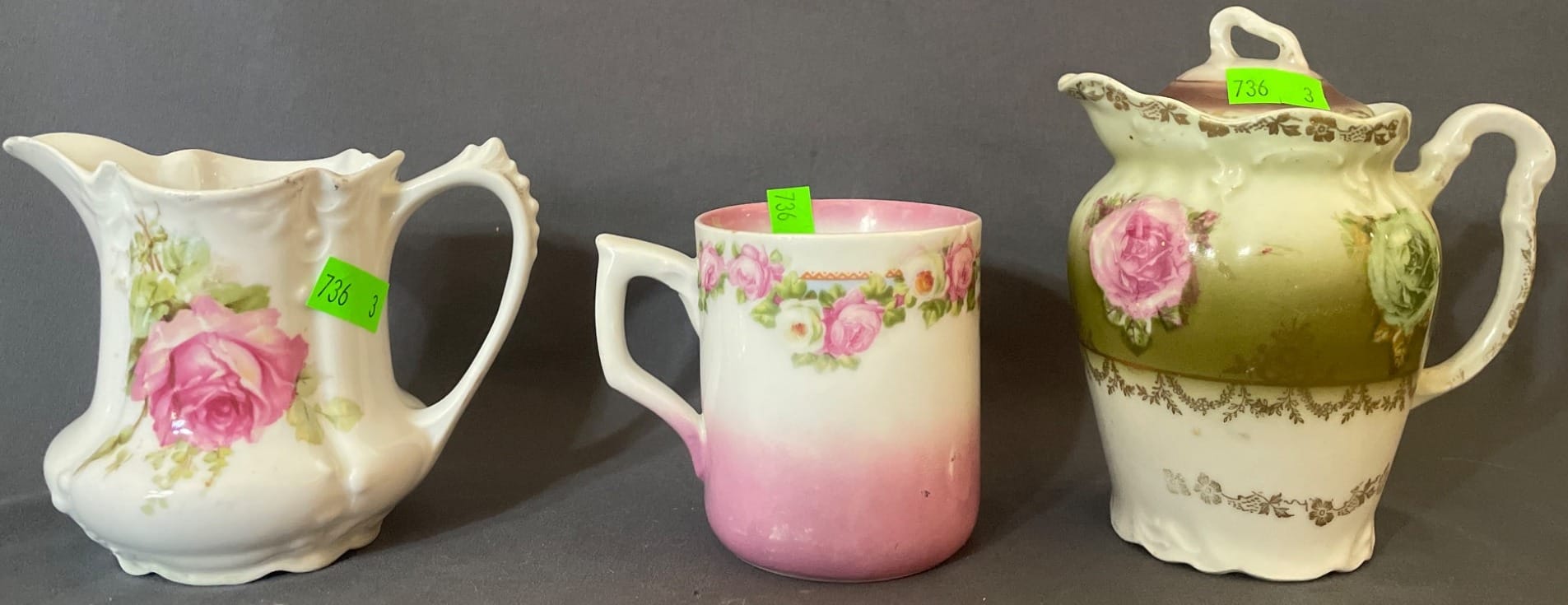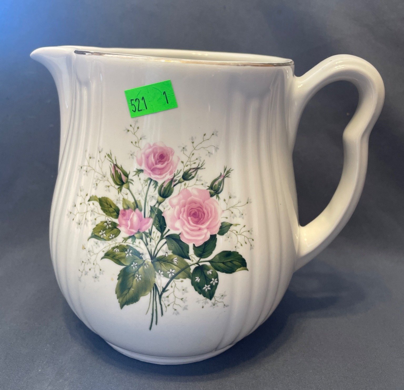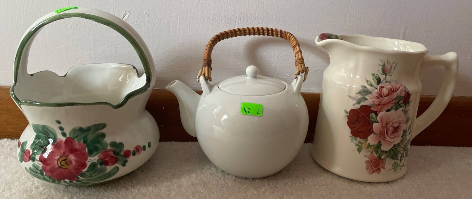 102 Floral Basket Made in Italy, White Teapot, and Rose-Patterned Pitcher 7”,6”,4”