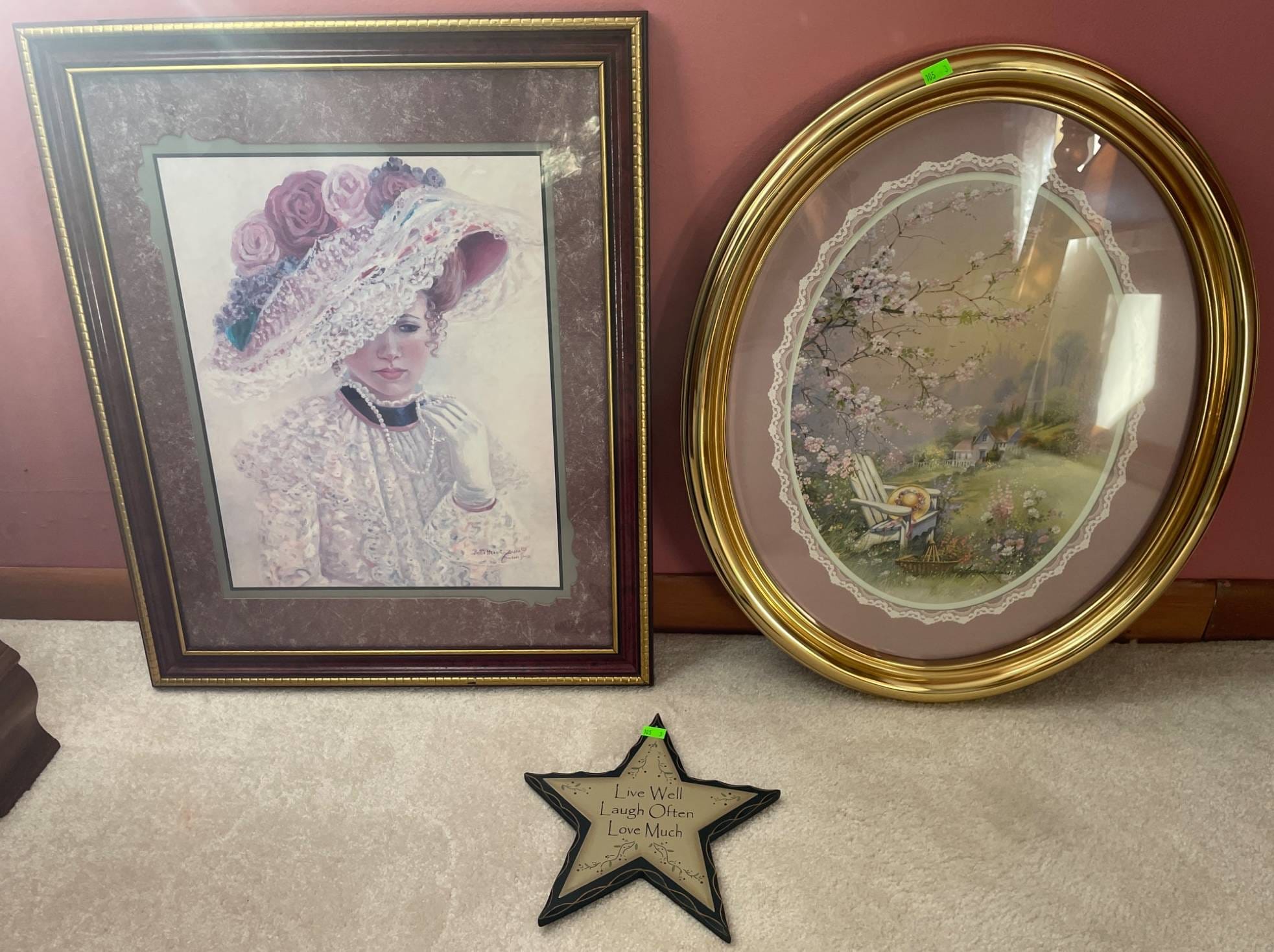 105 2 Framed Prints With Gold-Tone and Brown Frames and Star-Shaped Wall Plaque 18”x22”, 18.5”x23”, 8”