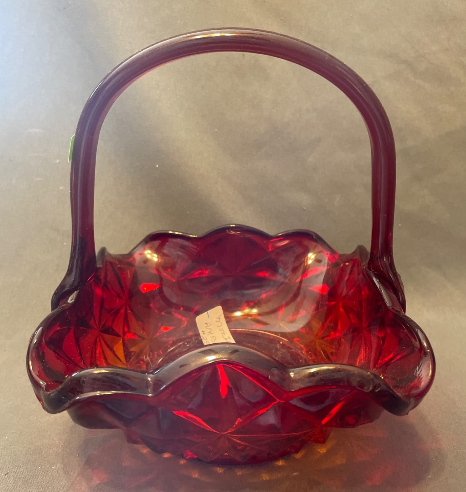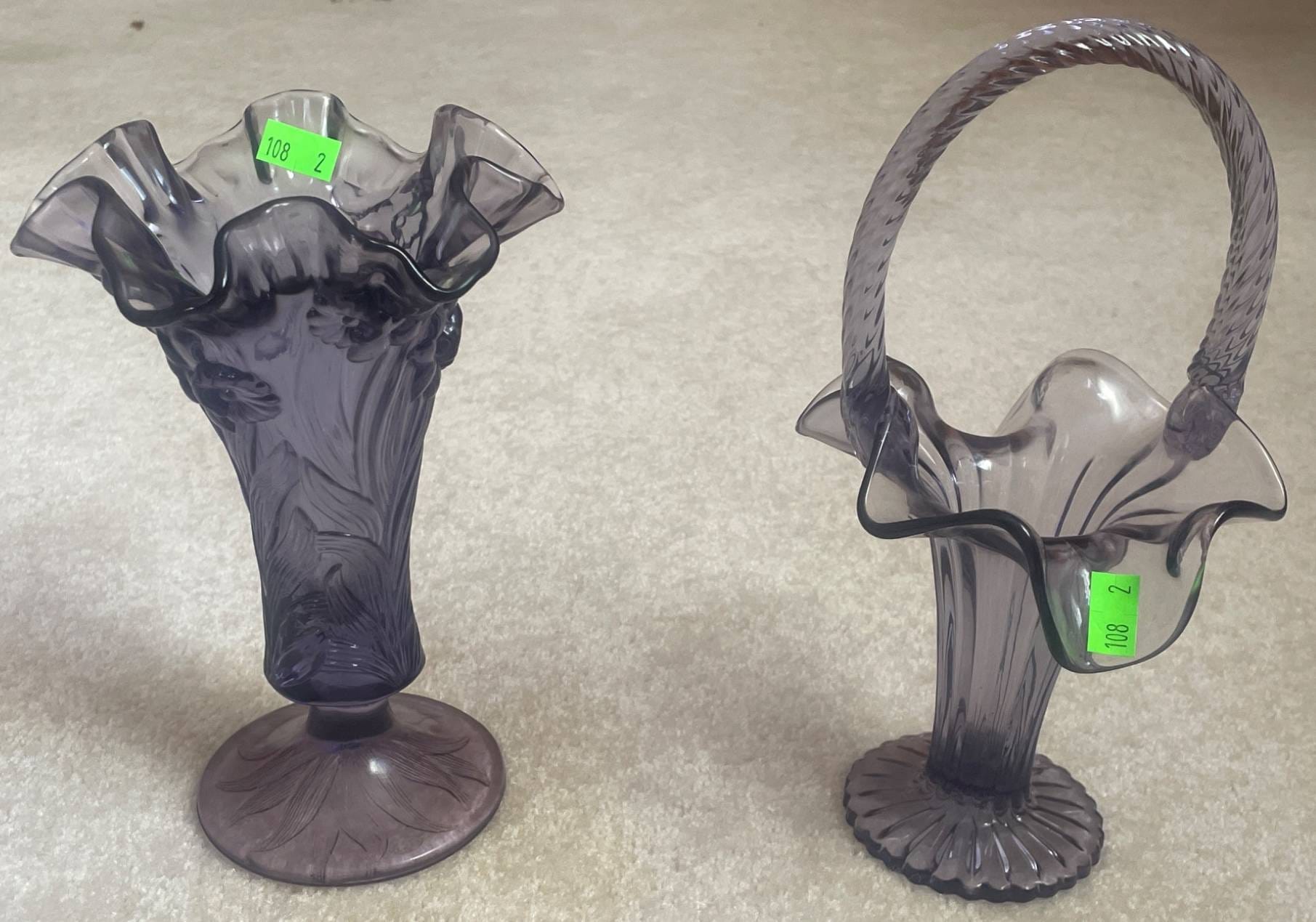 108 Fenton Amethyst Lilac Fluted Basket and Fenton Amethyst Glass Daffodils Vase. 8”