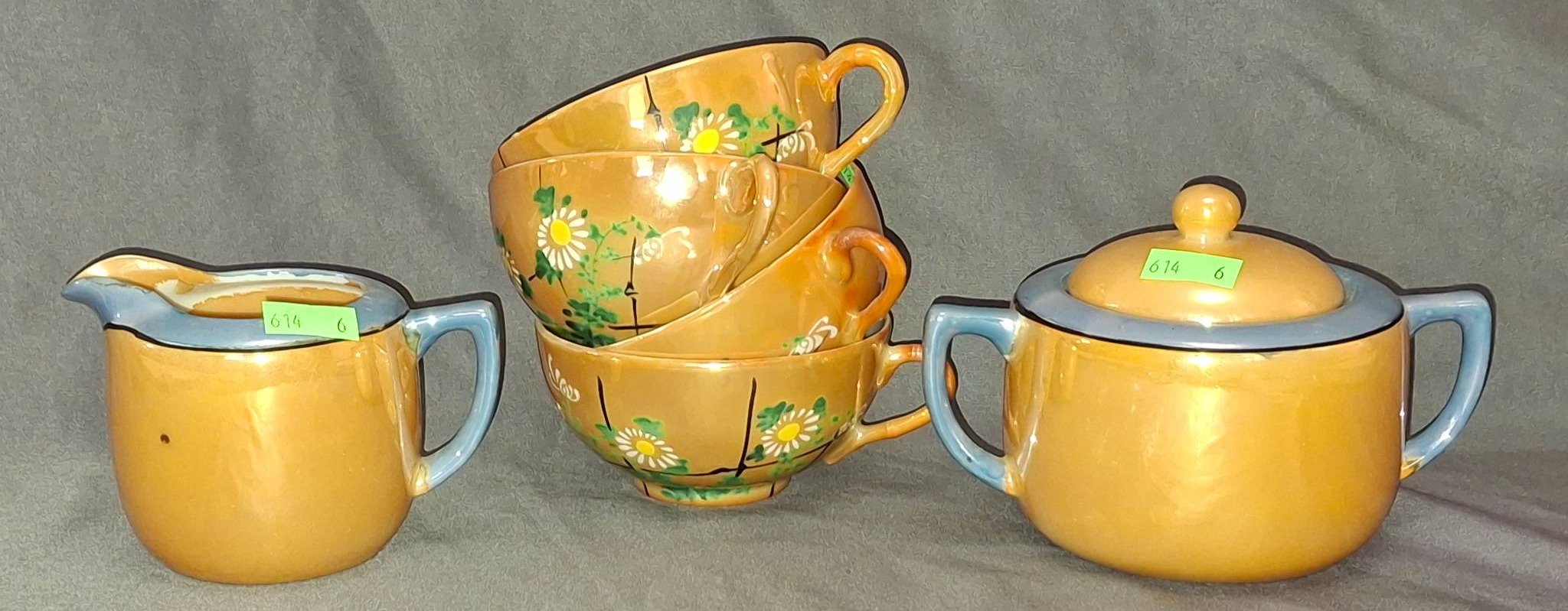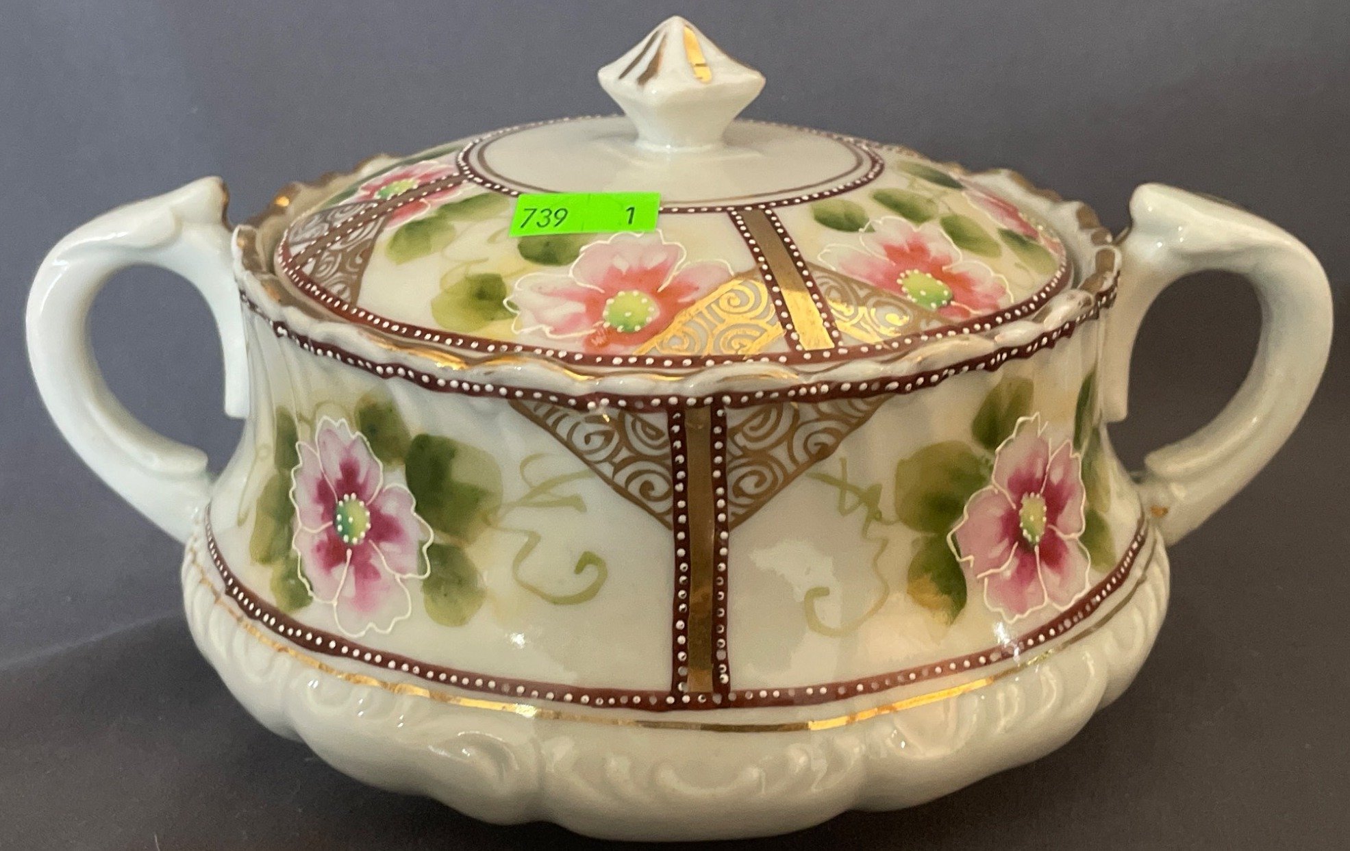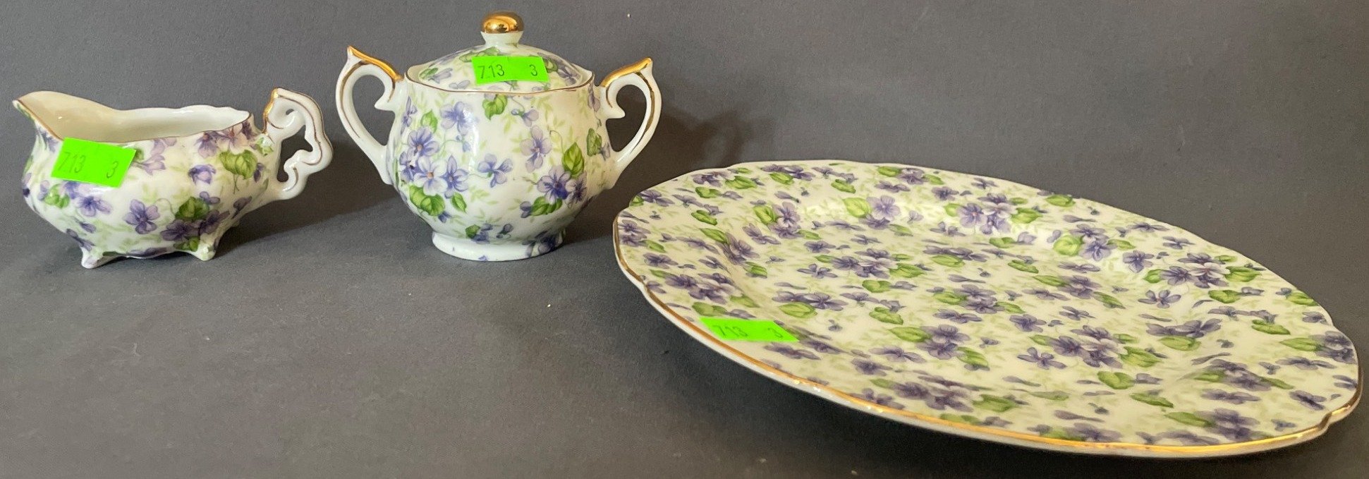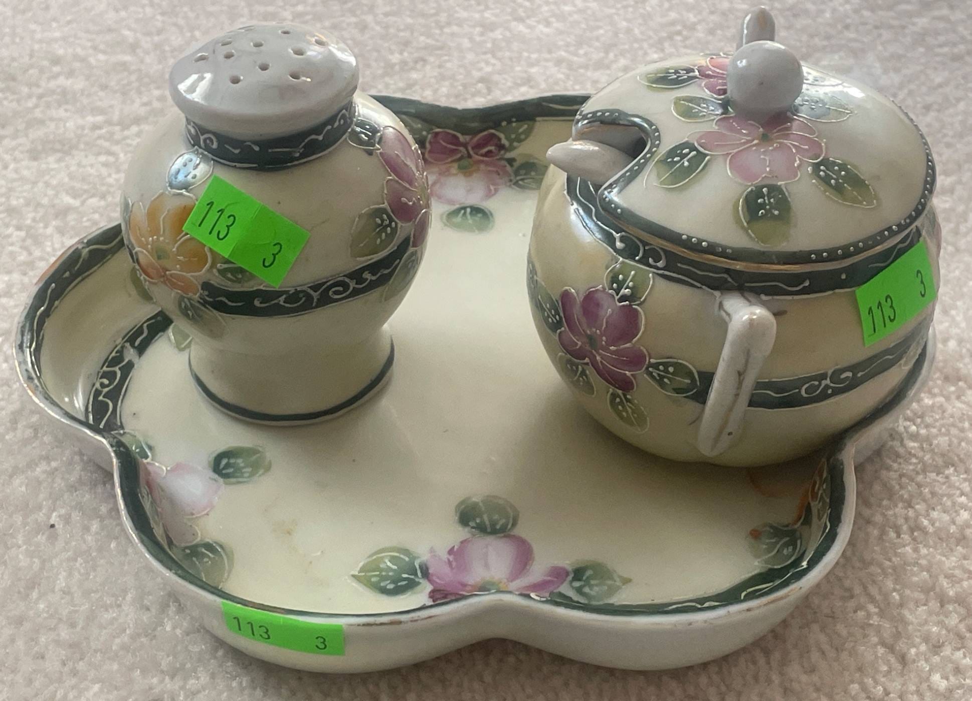 113 Floral Tray with Sugar Bowl, Lid, Spoon, and Shaker 7”,3”