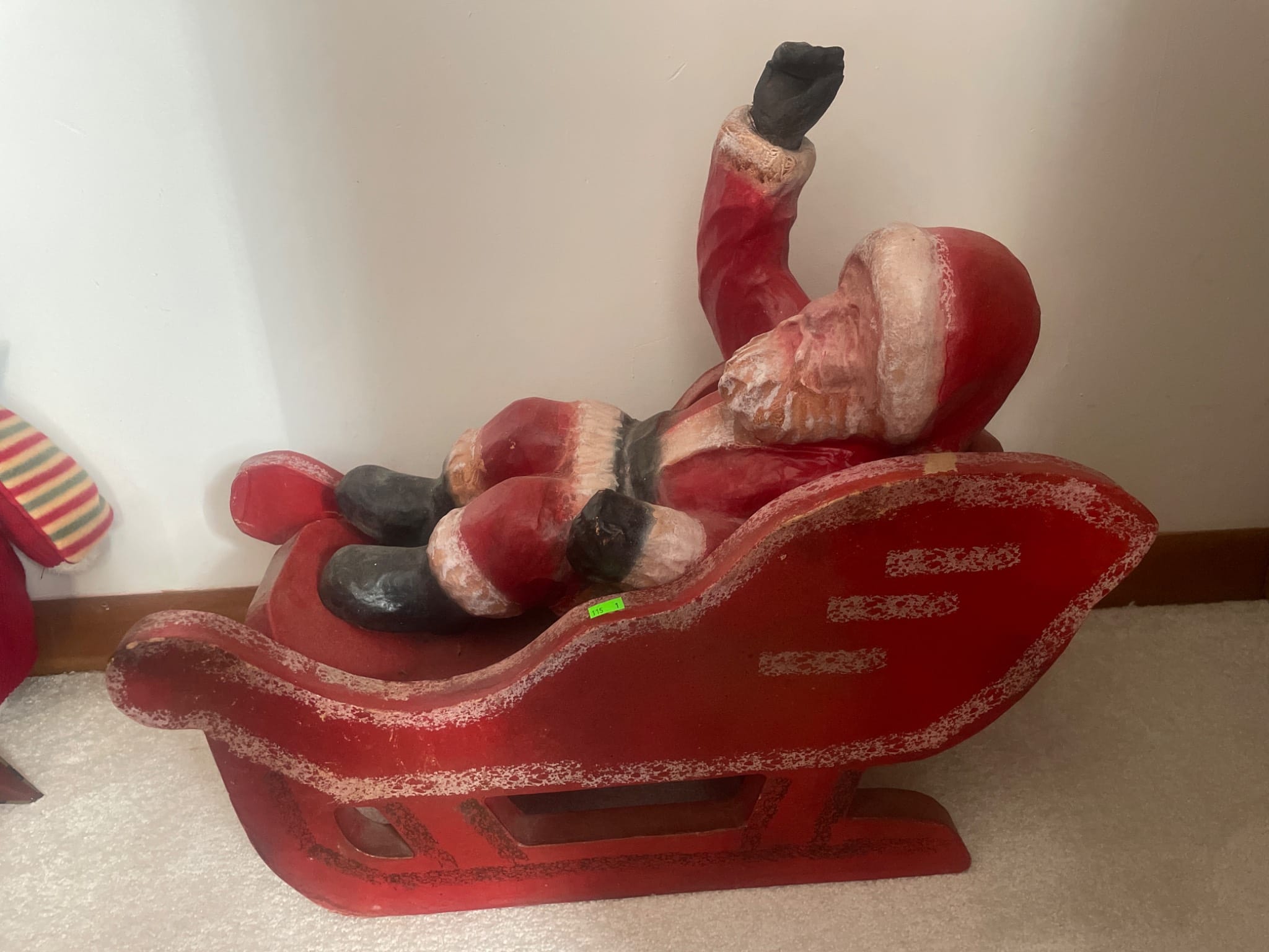 115 Paper Mache Sculpture of Santa Claus Reclining in a Red Sleigh 23”