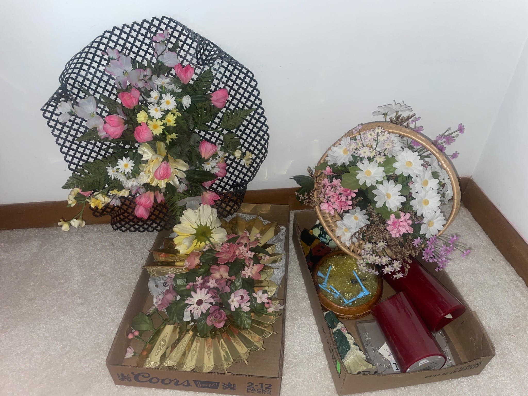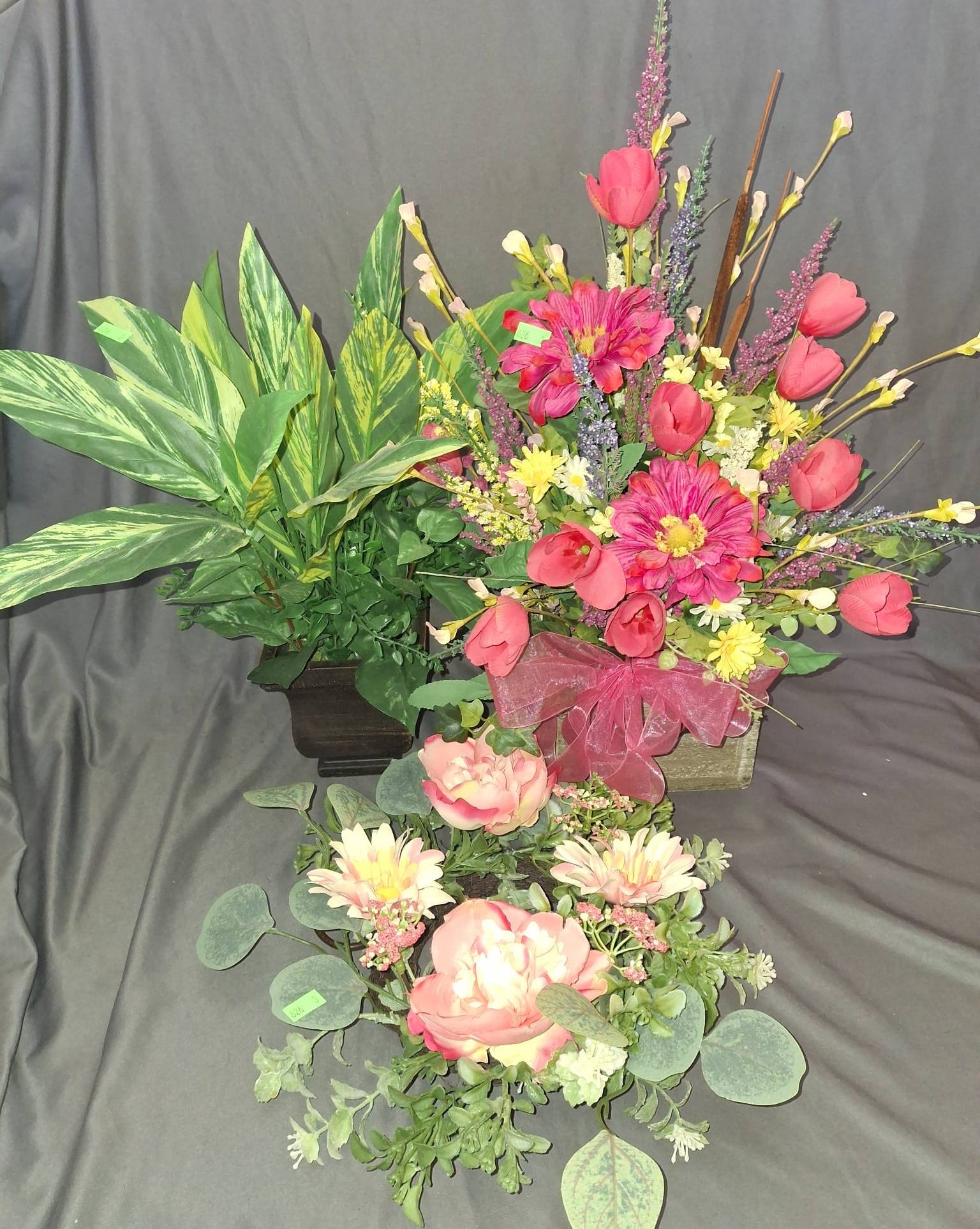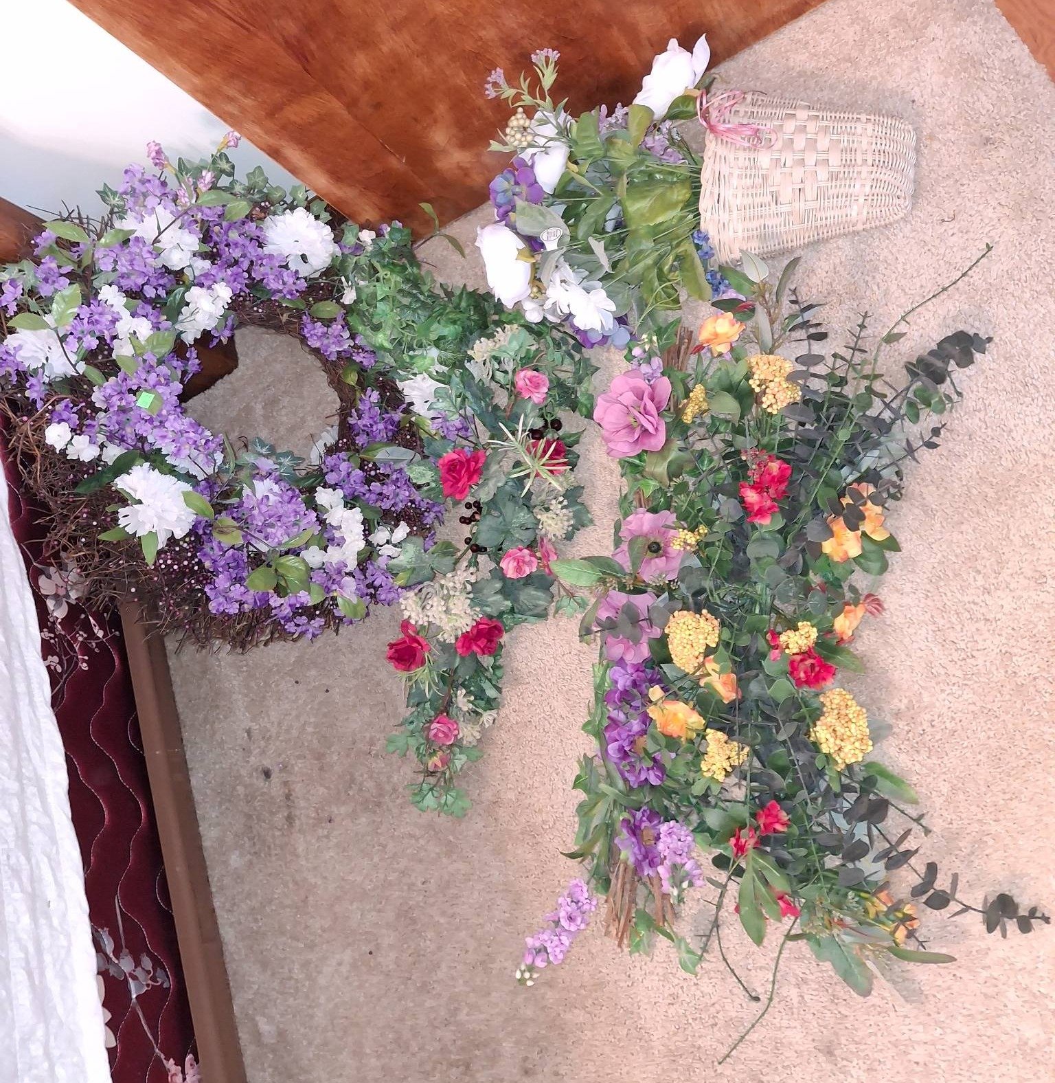 220 Artificial Floral Wreath, Hanging Basket, and Greenery Arrangement