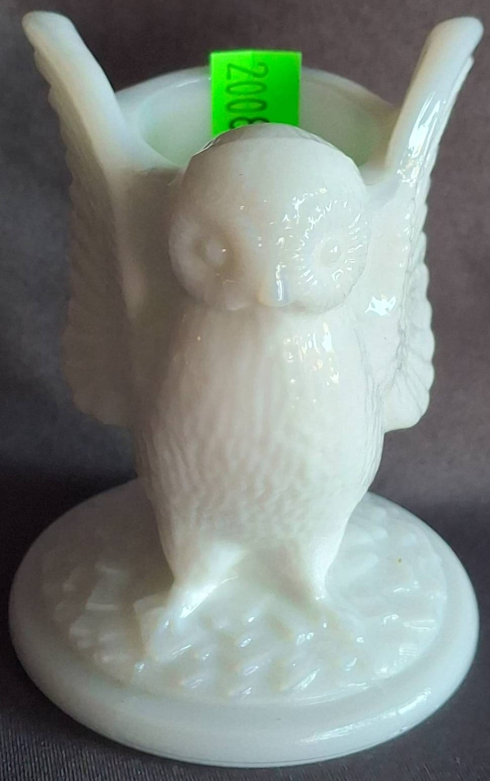 2008 Westmoreland Milk Glass Owl-Form Toothpick Holder on Round Base 3? Hgt.
