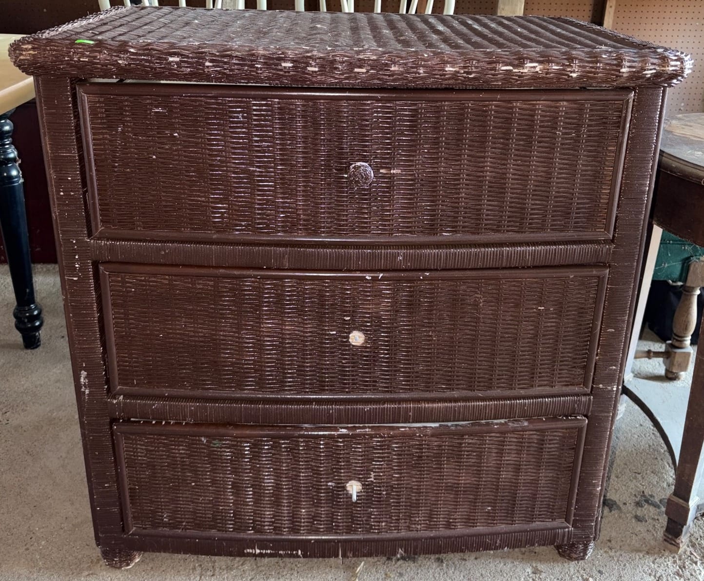 2038 Brown Wicker-Style 3-Drawer Dresser (shows wear) 34x23x33?