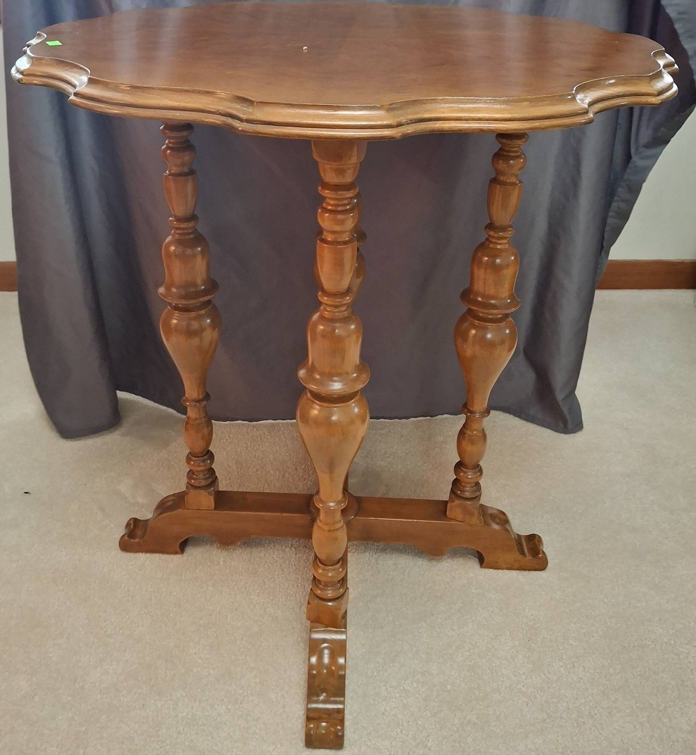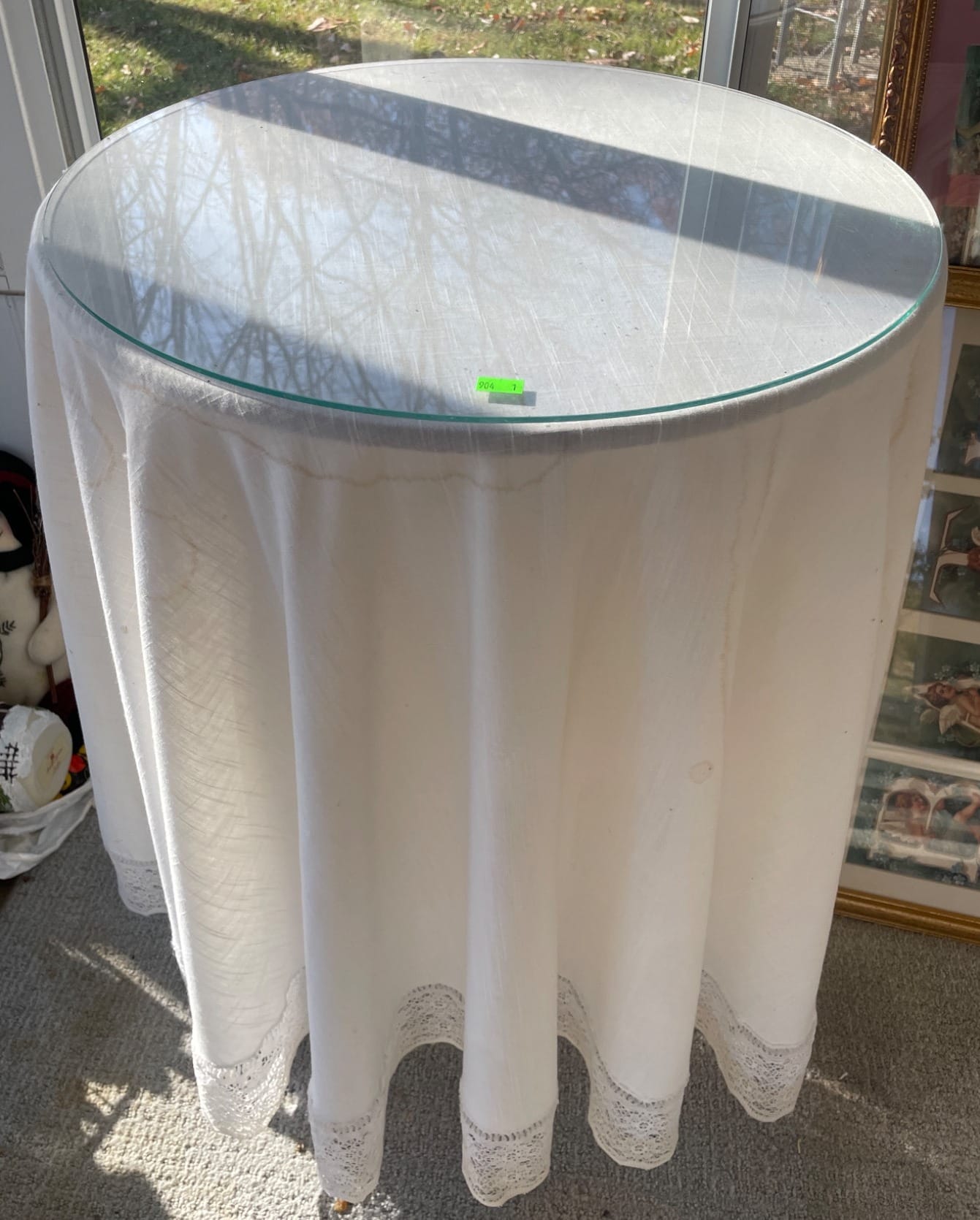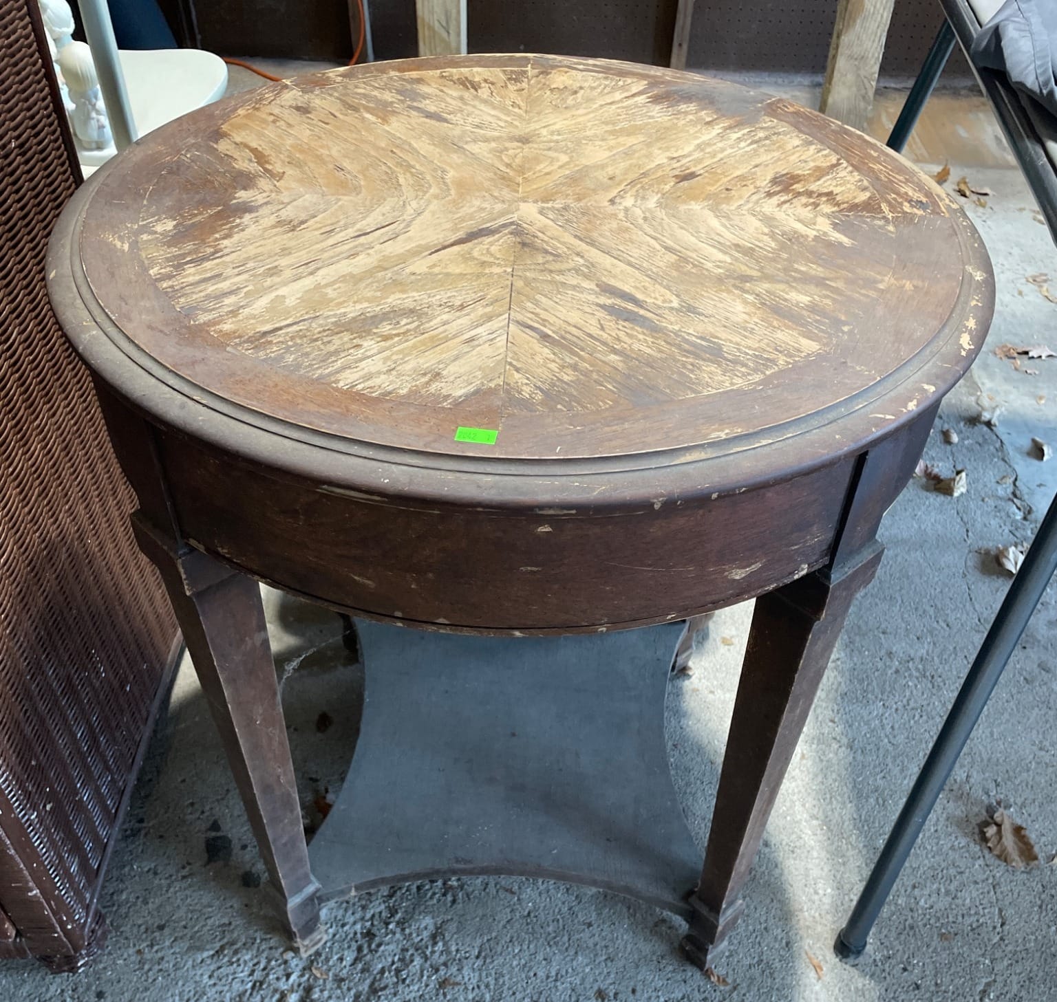 2042 Round Wood Veneer Table with Tapered Legs and Lower Shelf (shows wear) 23”x26”