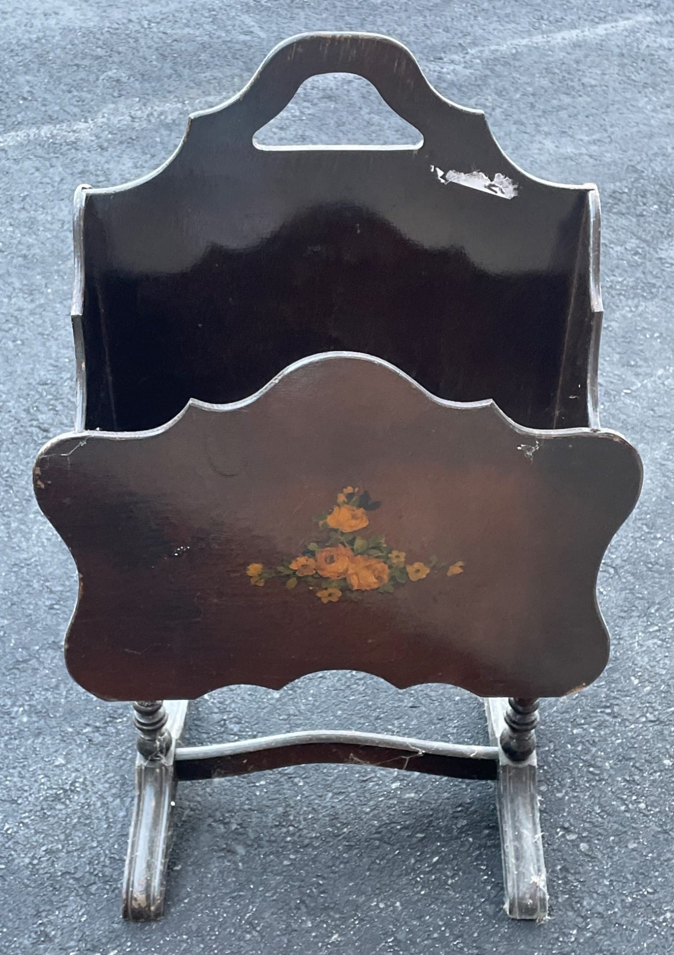 2050 Painted Wood Magazine Rack With Floral Detailing and Handle 14”x9”x24”