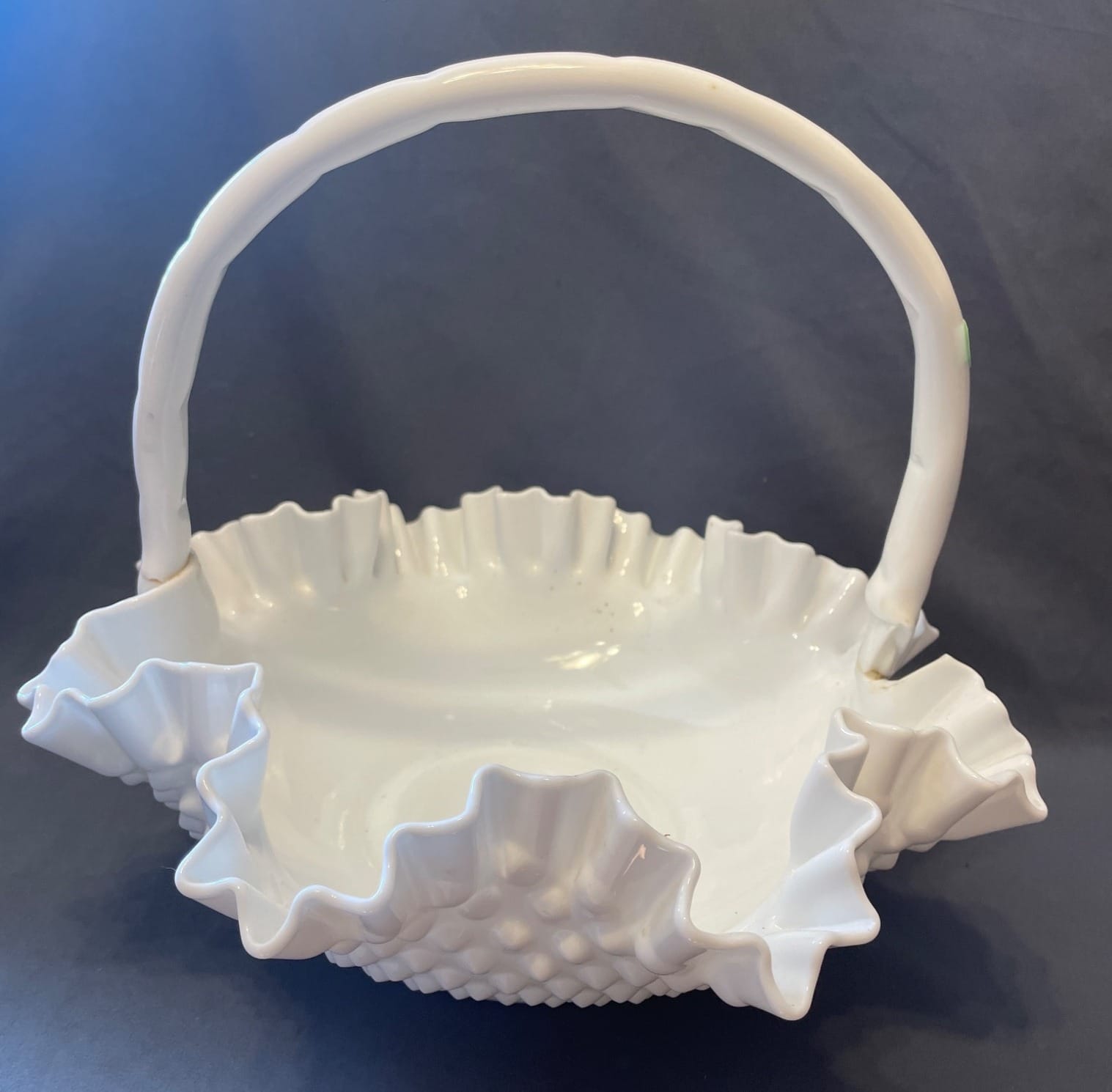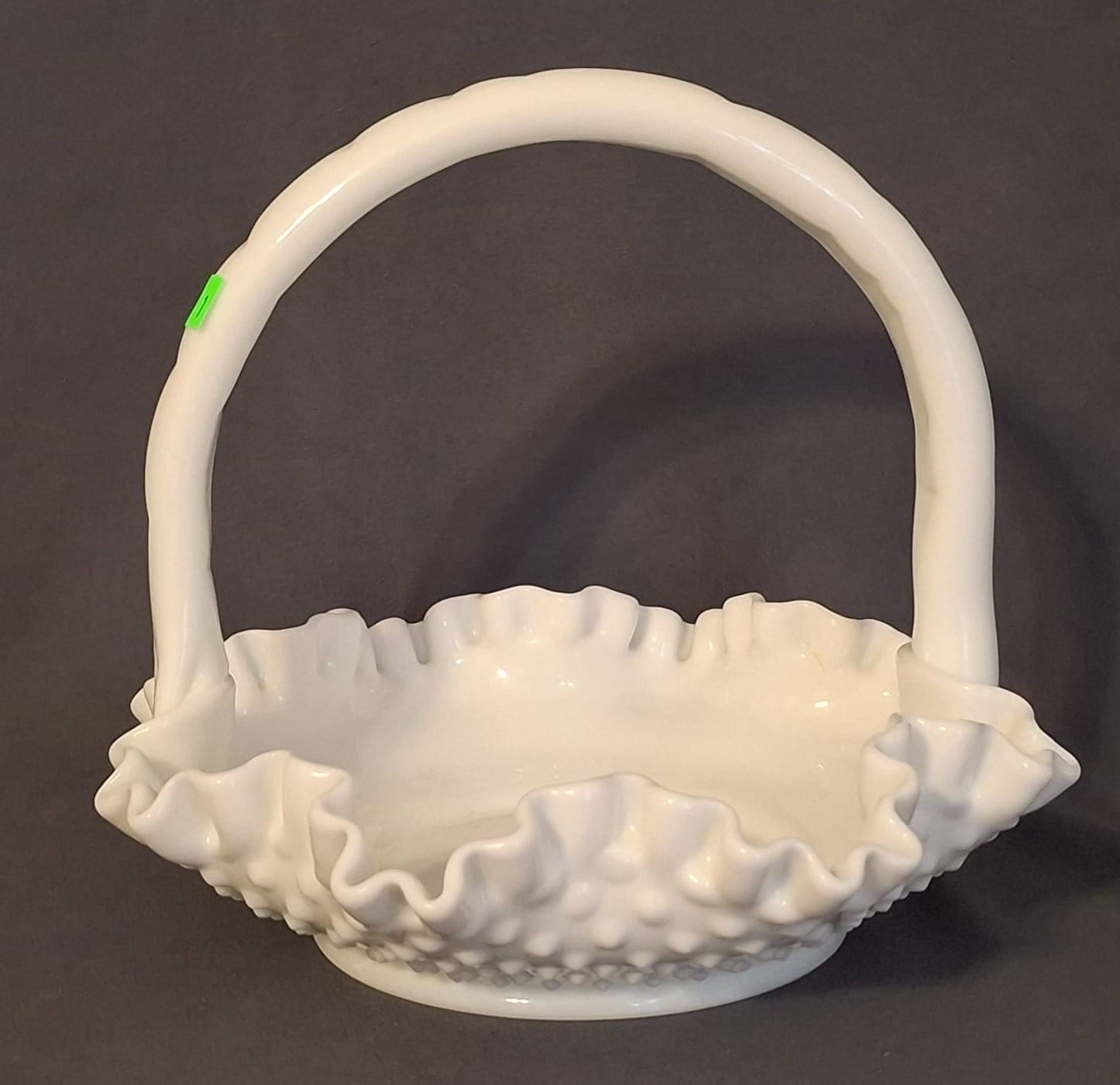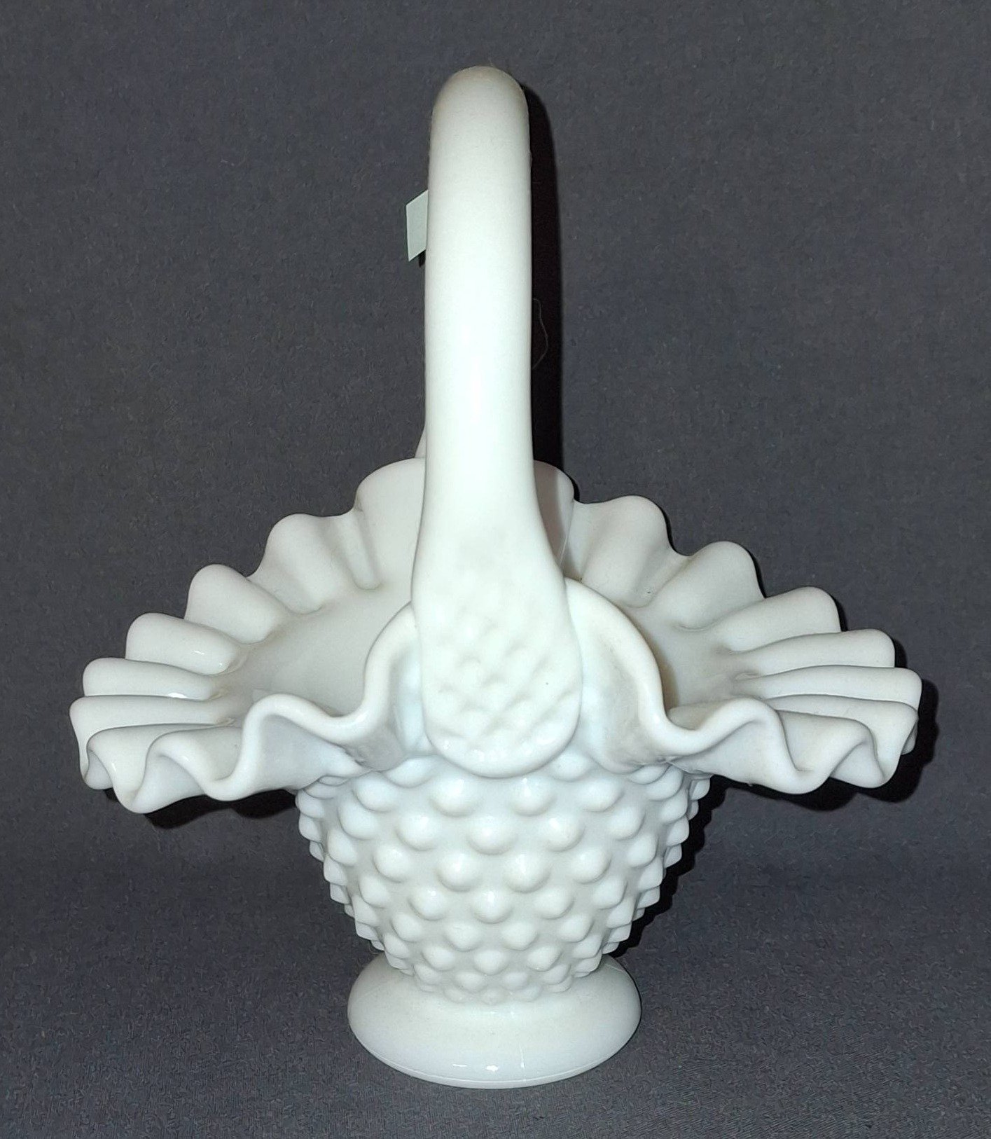 213 Fenton Milk Glass Basket with Hobnail Pattern and Ruffled Edge, 6?