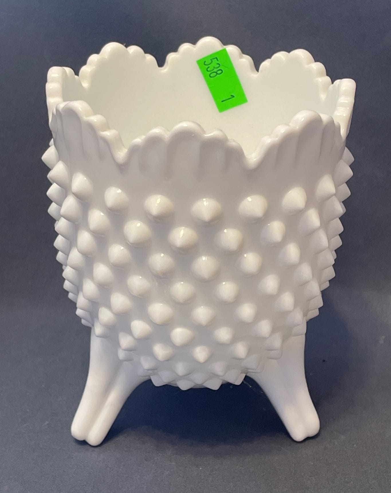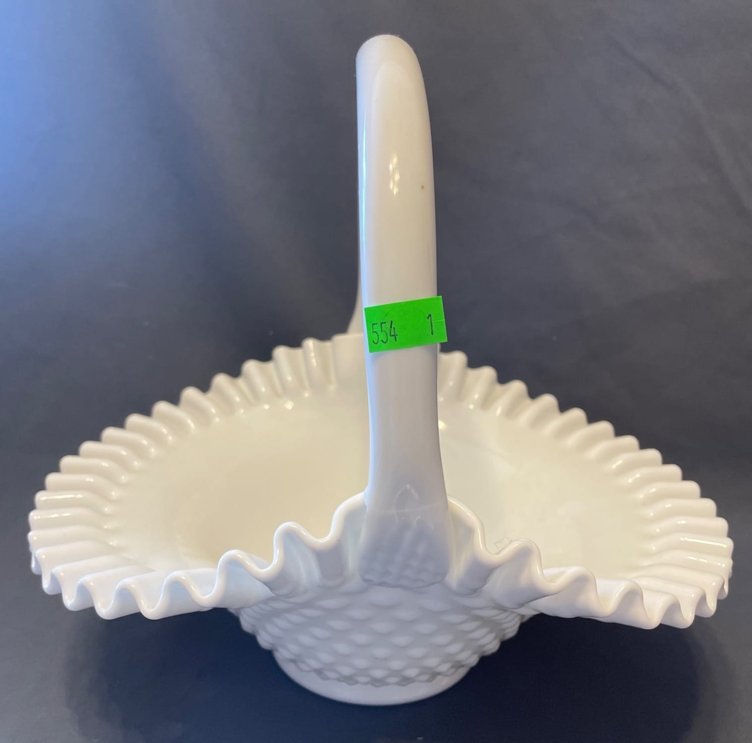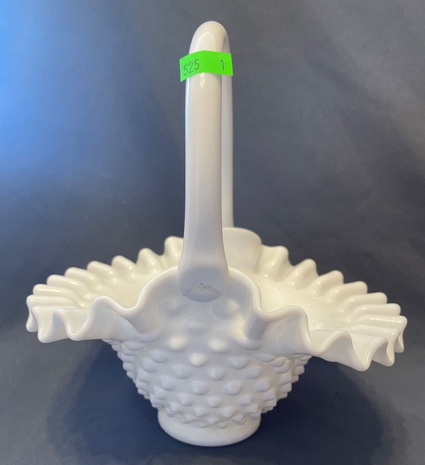 213 Fenton Milk Glass Basket with Hobnail Pattern and Ruffled Edge, 6?