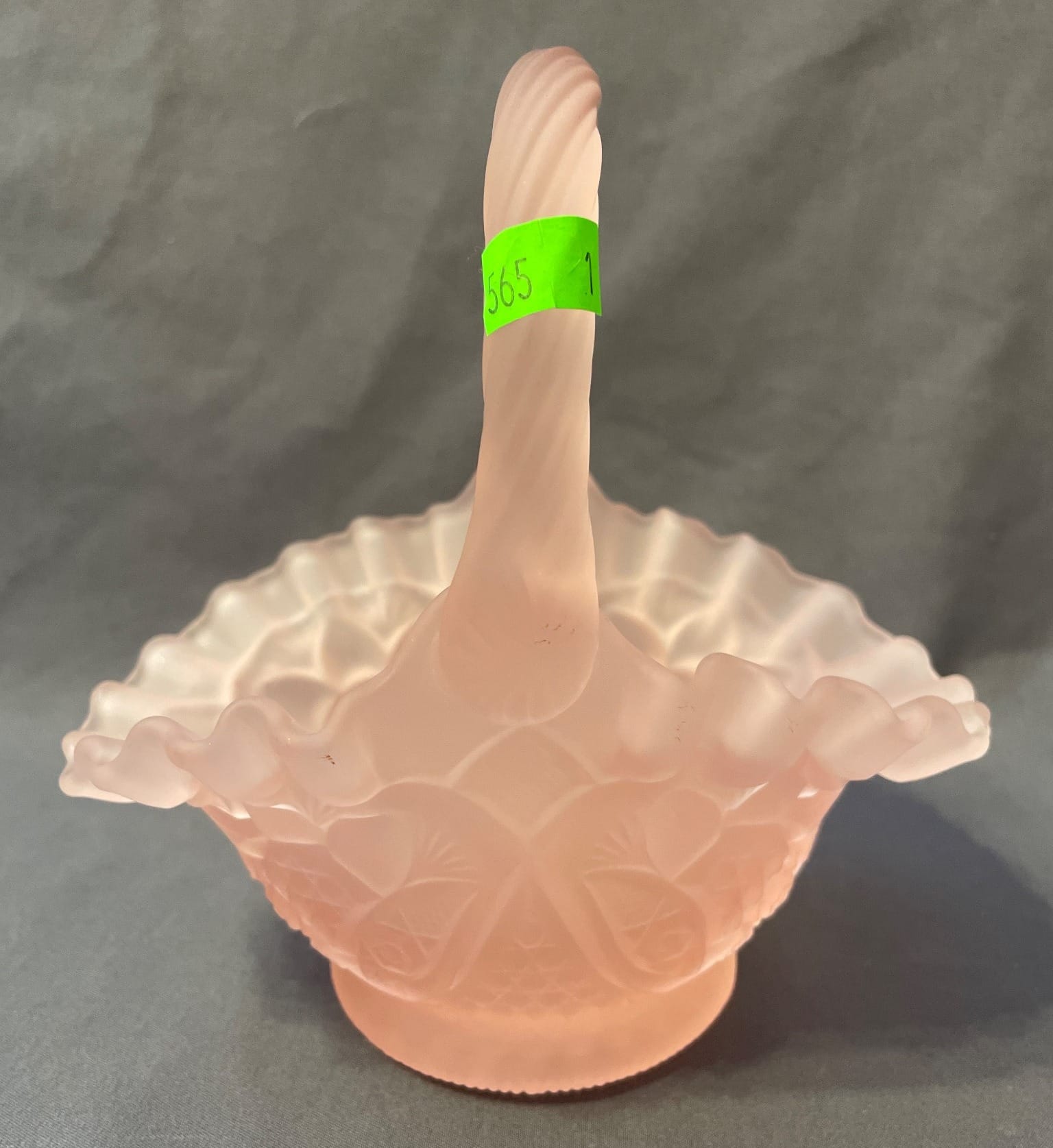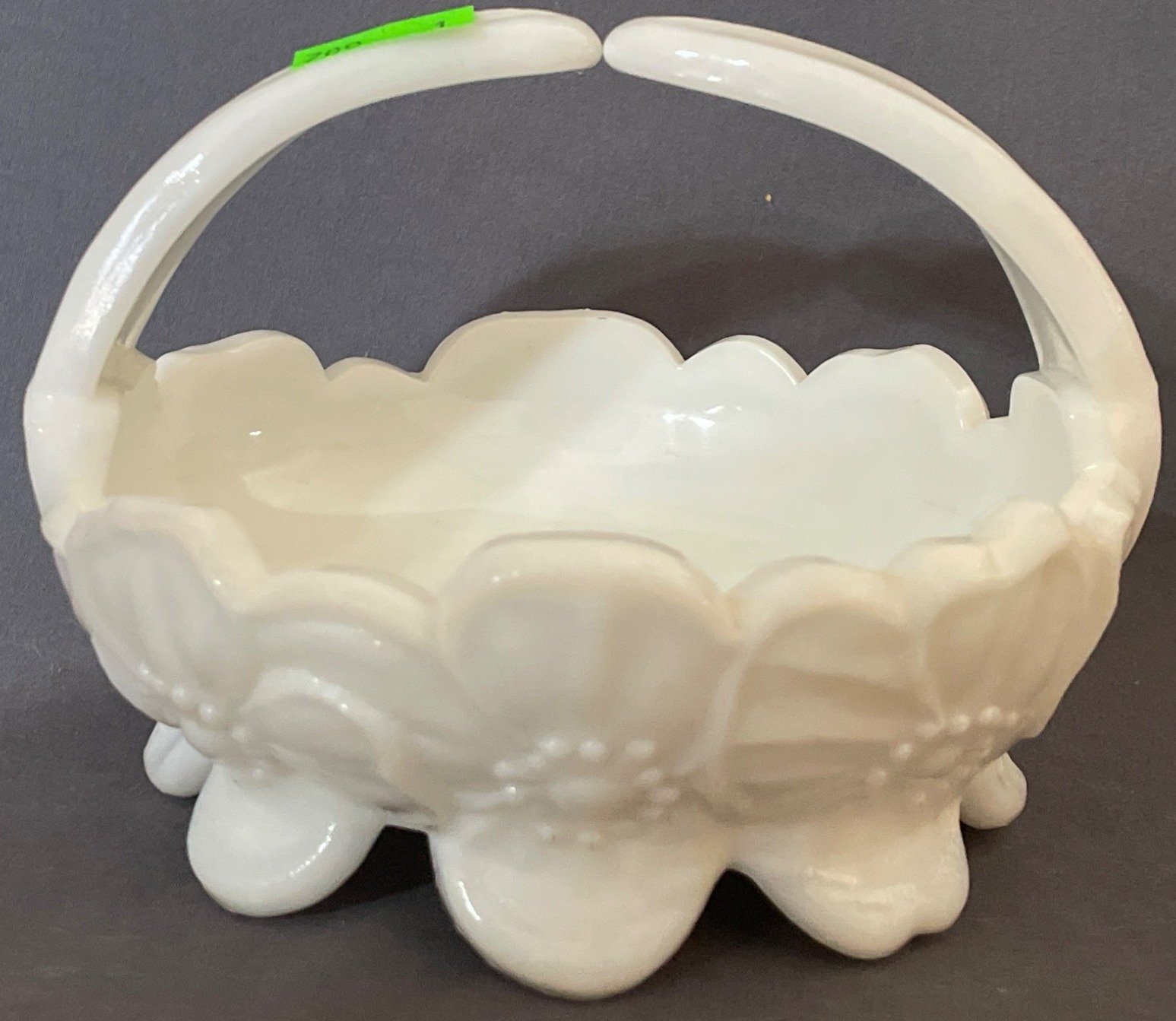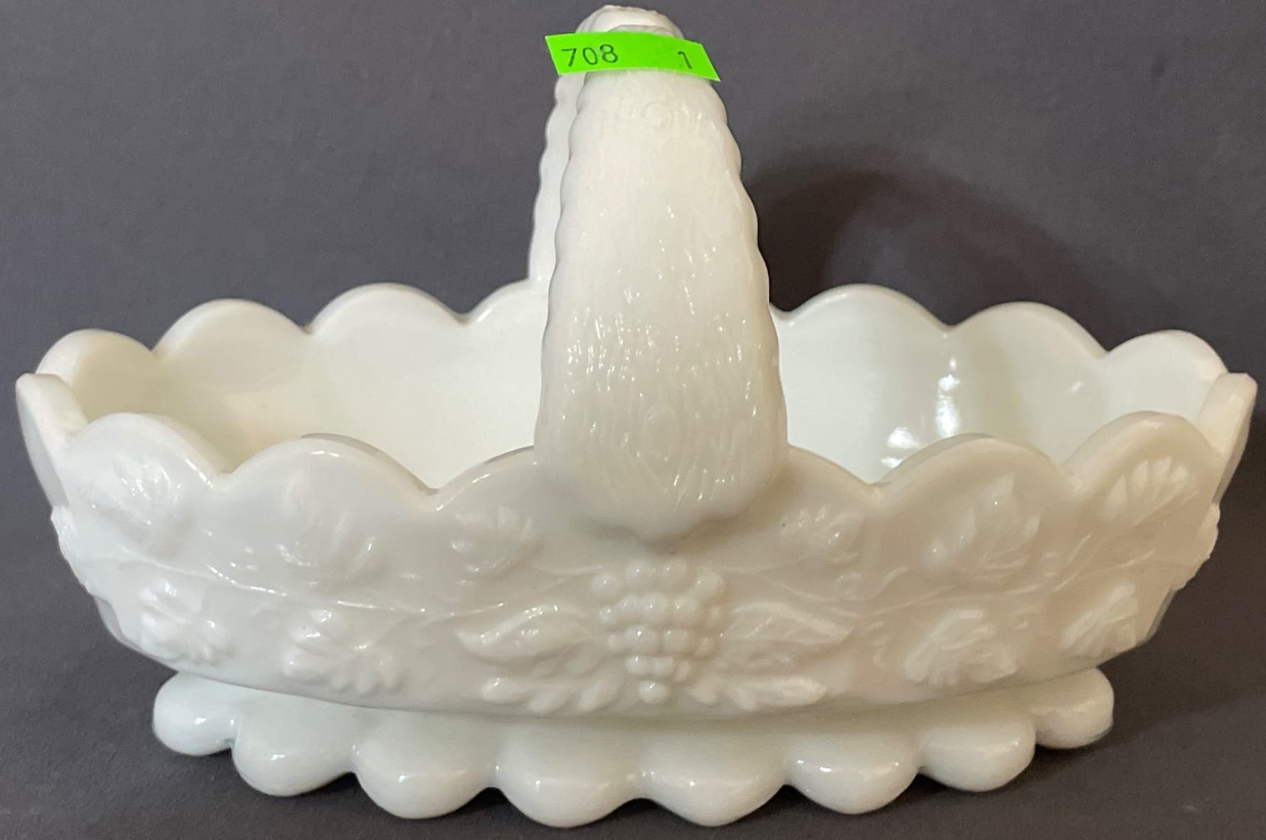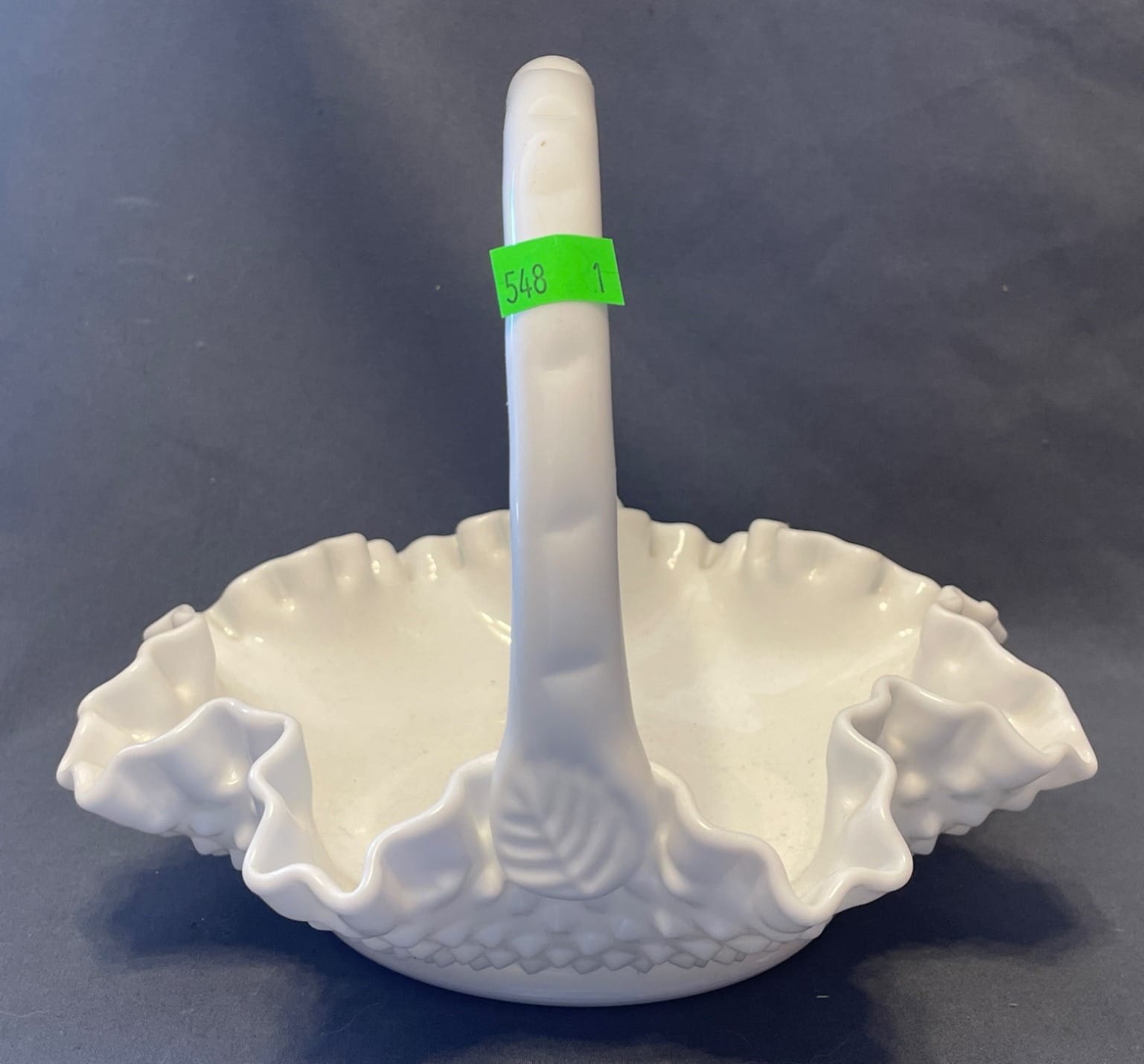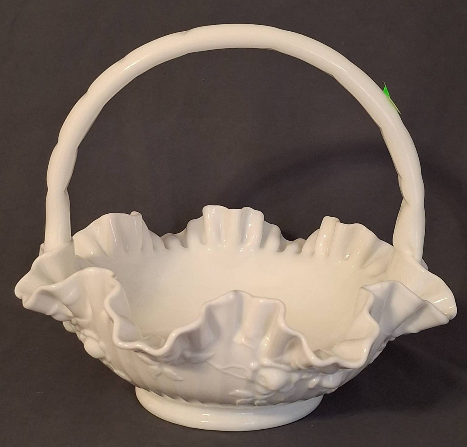207 Fenton Milk Glass Ruffled-Edge Basket with Handle 9?x8?