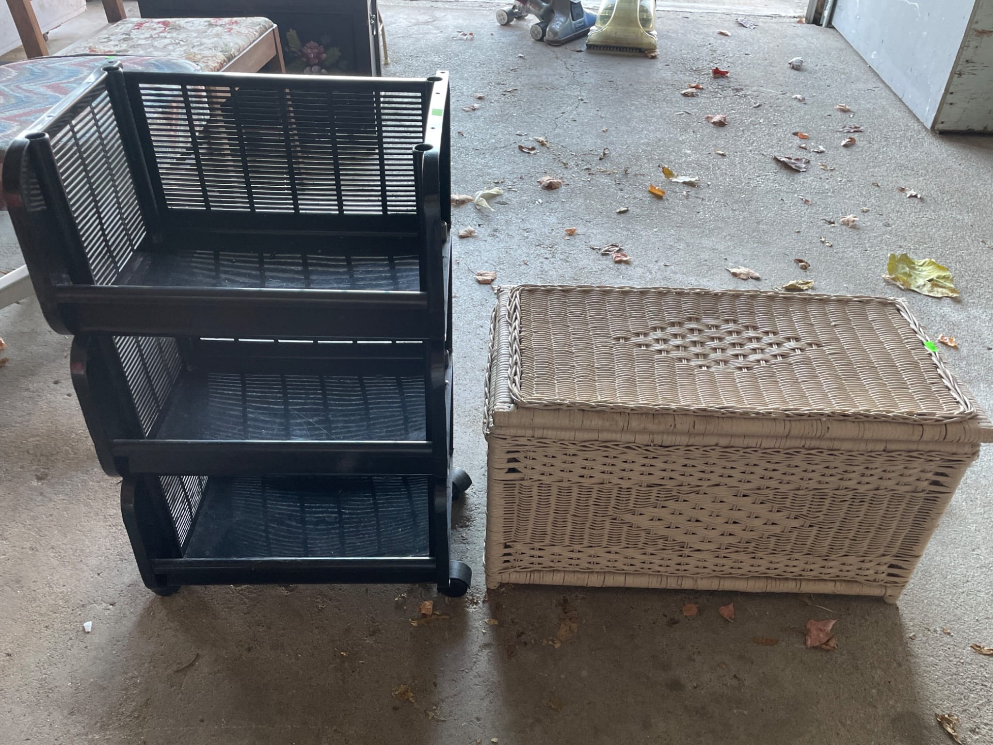 2083 Black 3-Tier Plastic Shelf Unit and Wicker Storage Trunk with Lid 24”x12”x14”, 16”x13”x27”