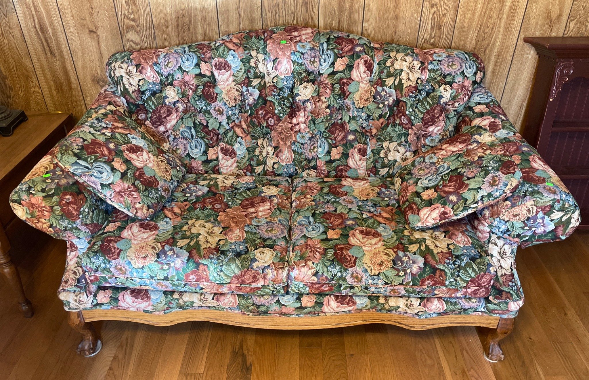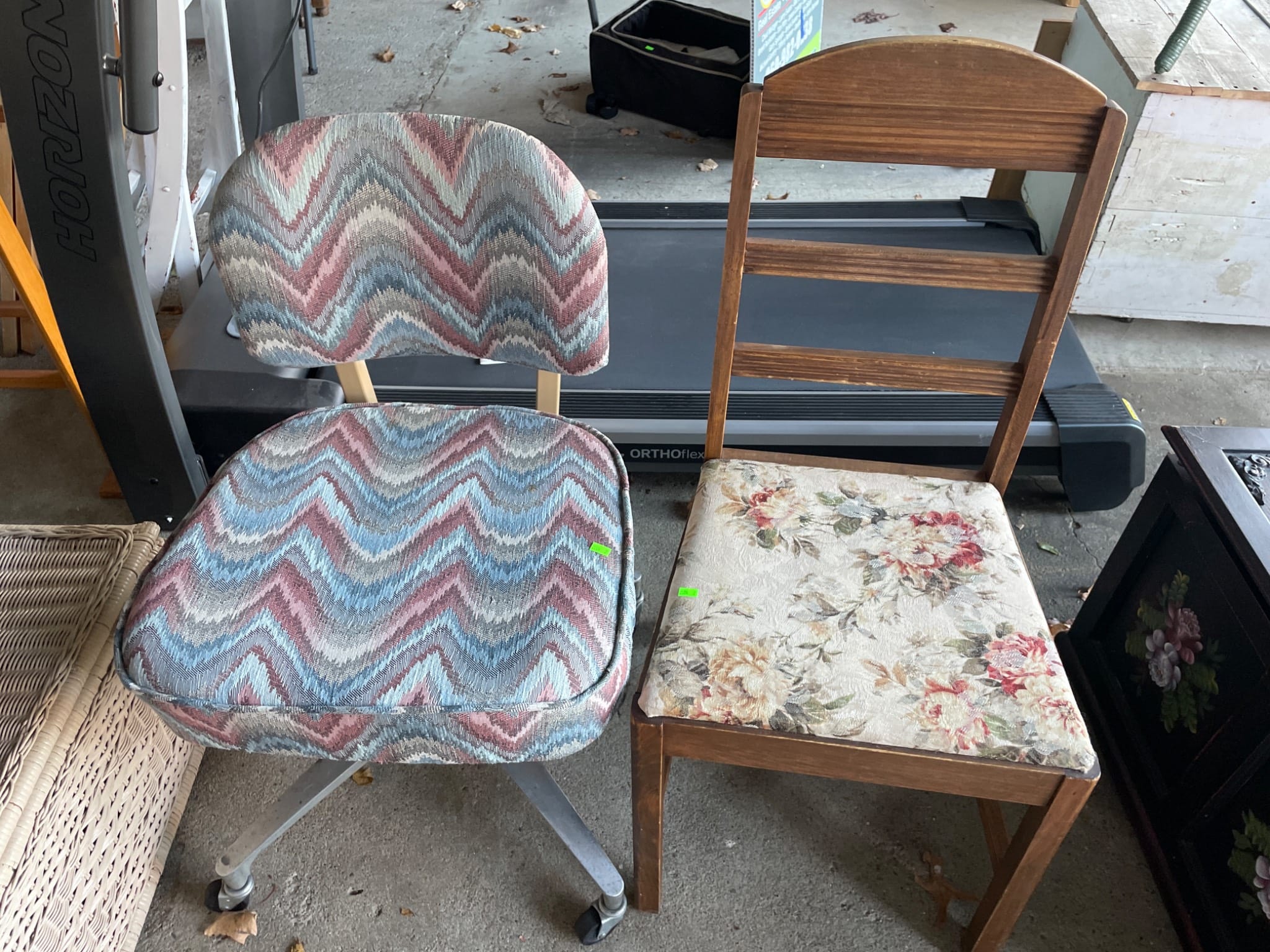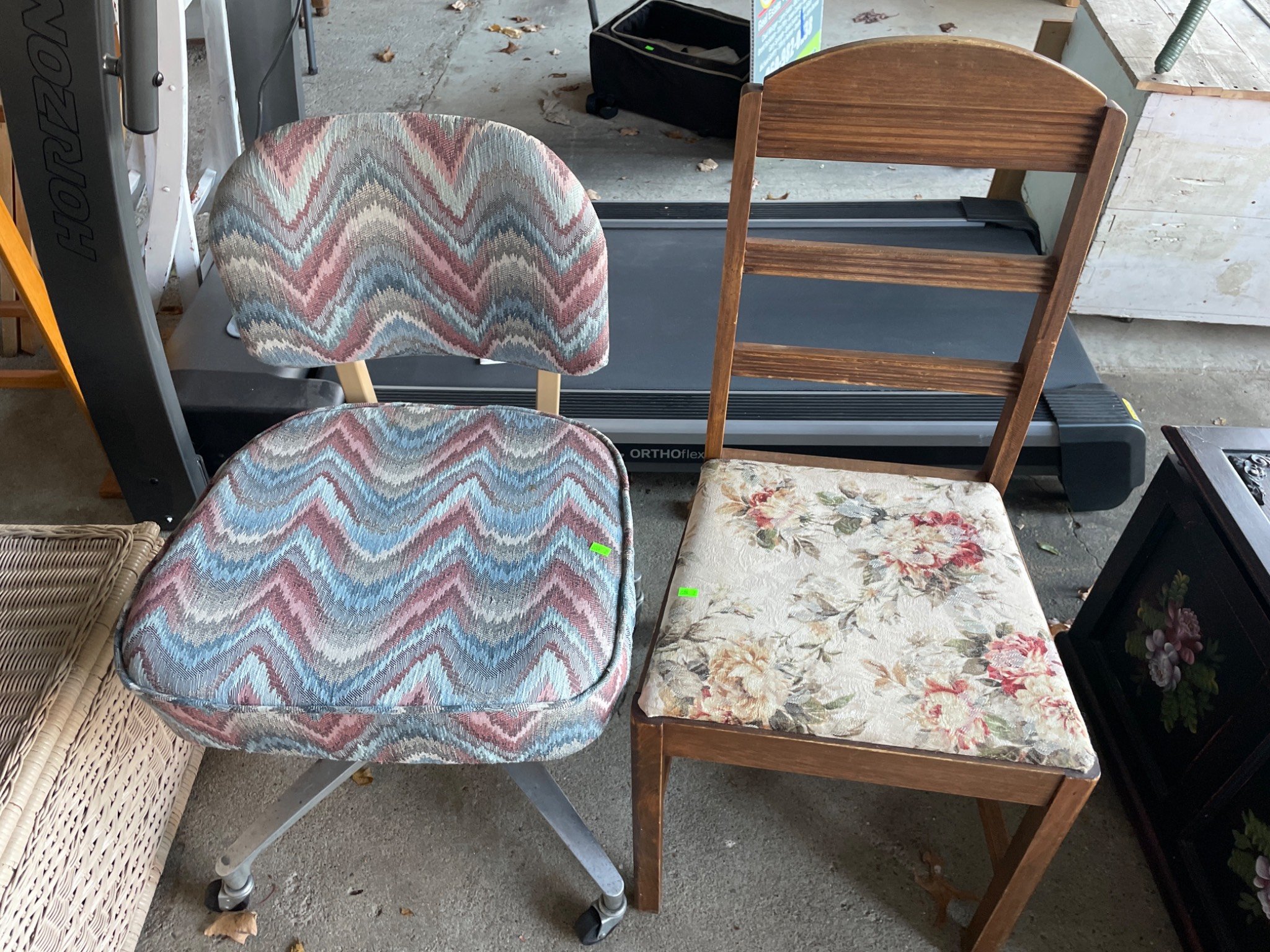 2084 Upholstered Office Chair on Casters and Ladder-Back Chair with Floral Seat 19”x17”x32”, 17”x15”x35”