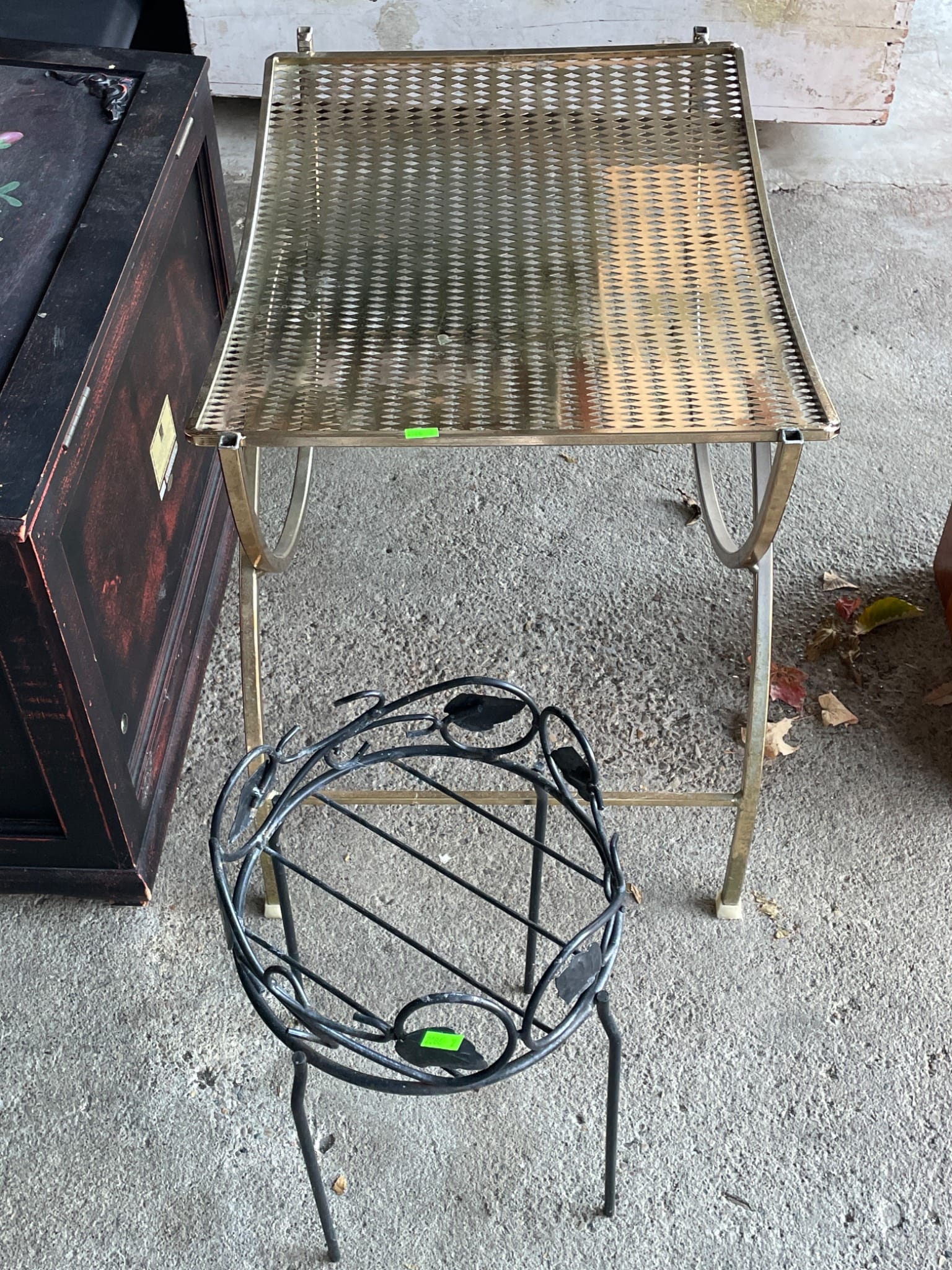 2086 Brass Perforated Stool and Black Metal Plant Stand 21”x16”x18” , 9”x15”