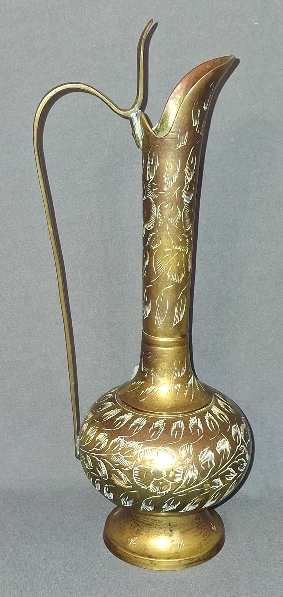 217 India World Gift Engraved Brass Pitcher with Handle and Marked Base 9? Hgt.