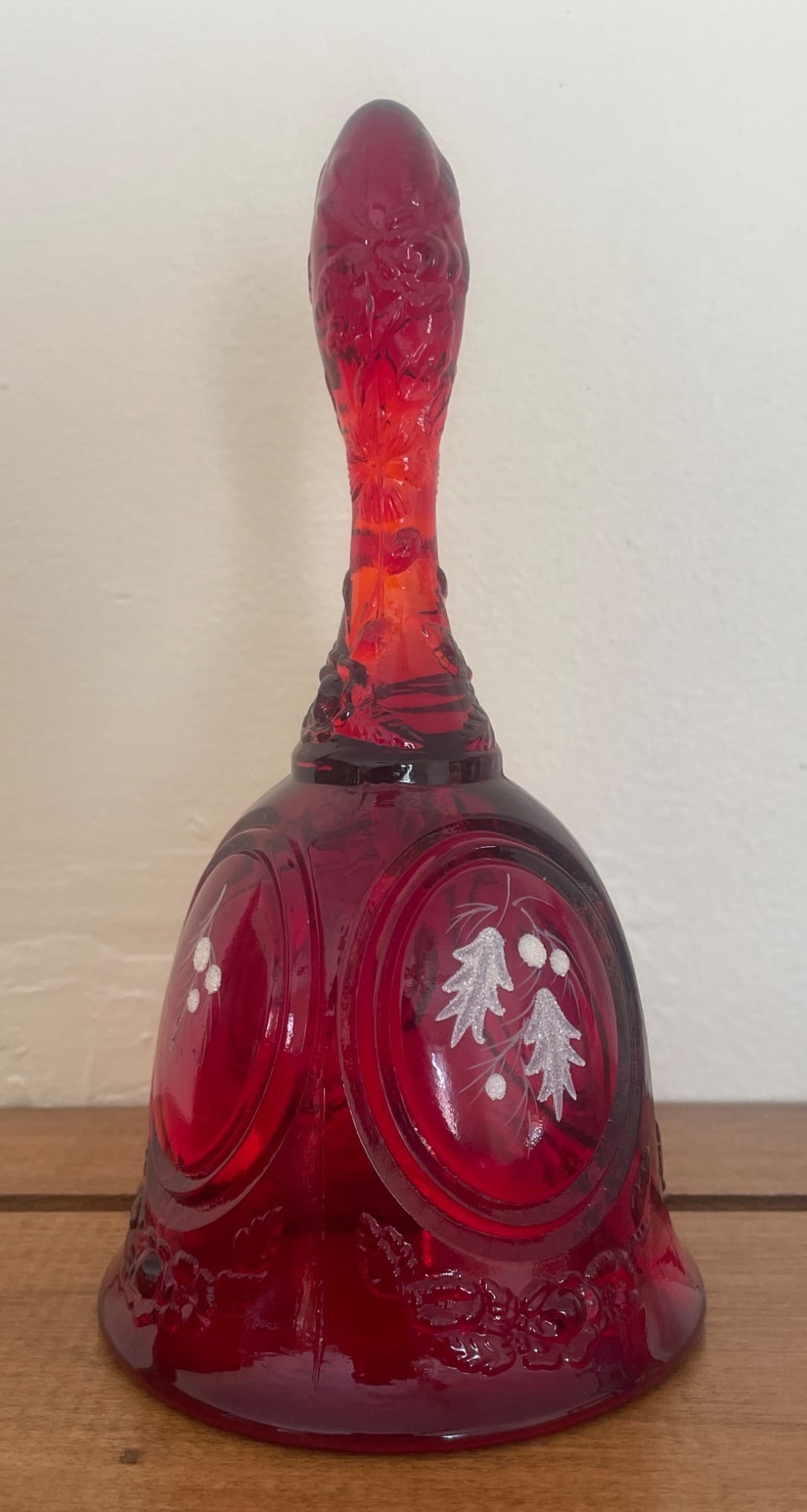 303 Fenton Ruby Red Glass Bell with Etched Floral Design 7”