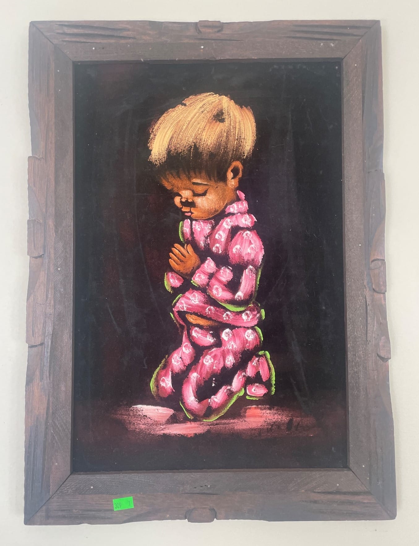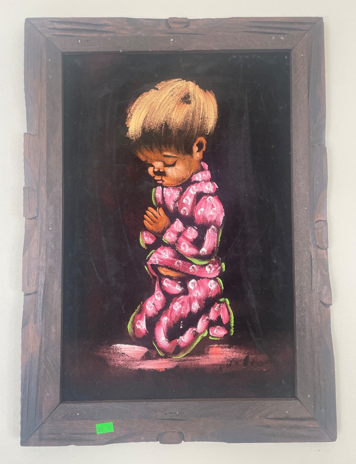 309 Framed Velvet Painting of Praying Child in Pink Pajamas 15”x21”