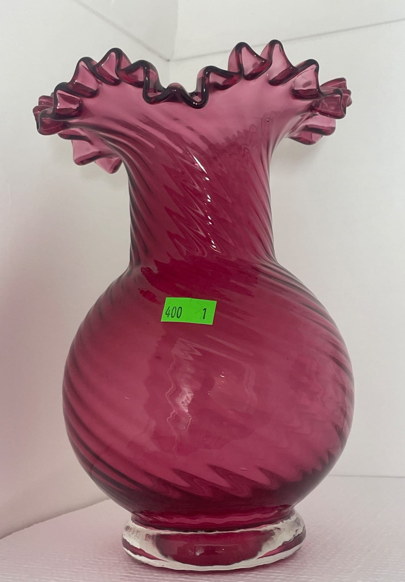 400 Fenton Style Cranberry Glass Vase with Swirled Body and Ruffled Rim 7.5”