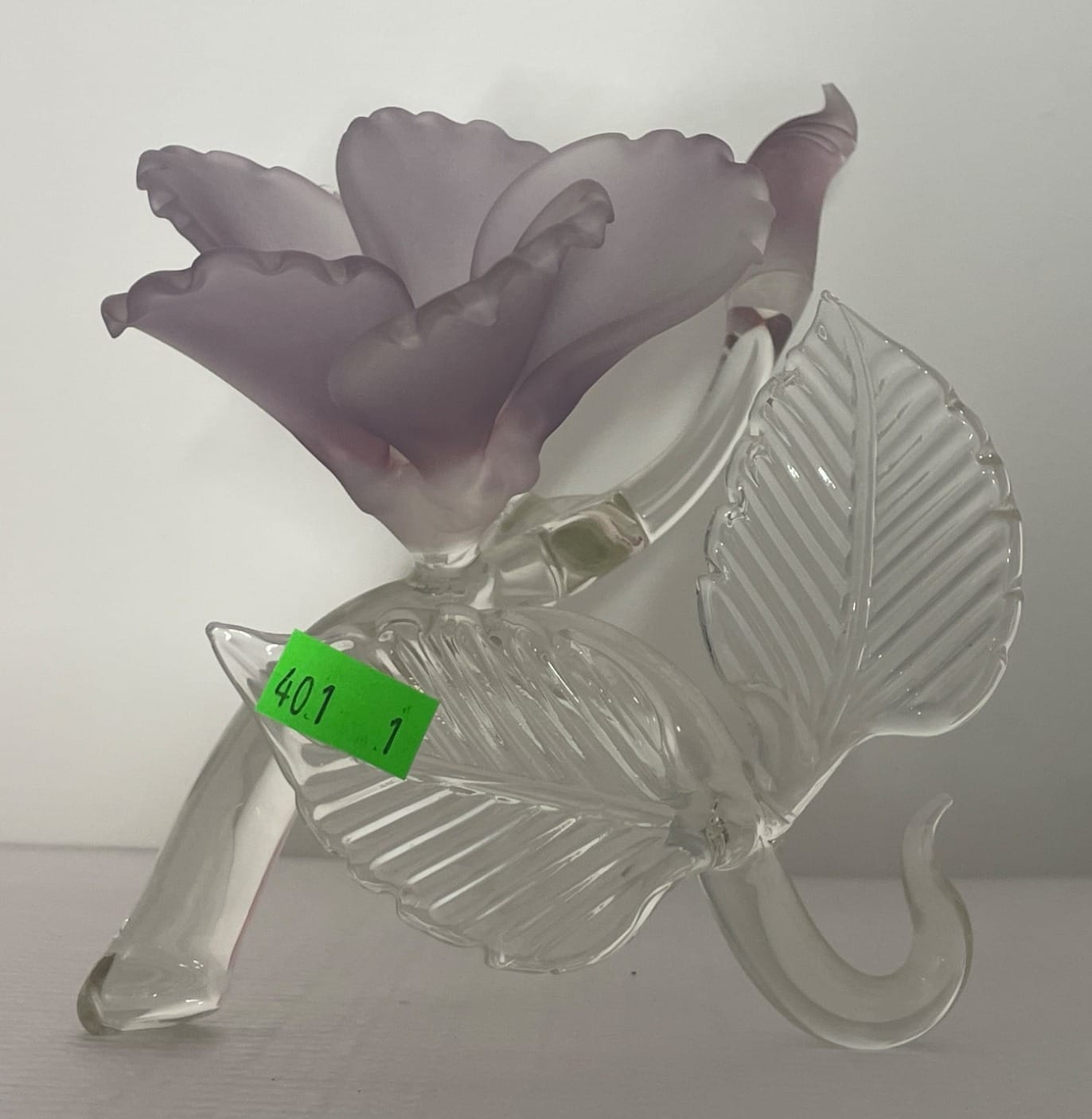 401 Purple and Clear Blown Glass Flower Sculpture with Leaf Accents 6.5”