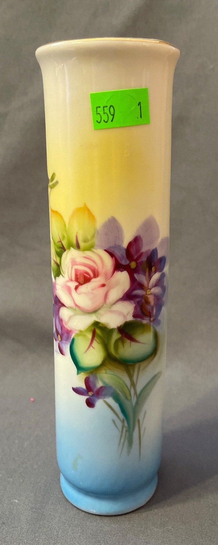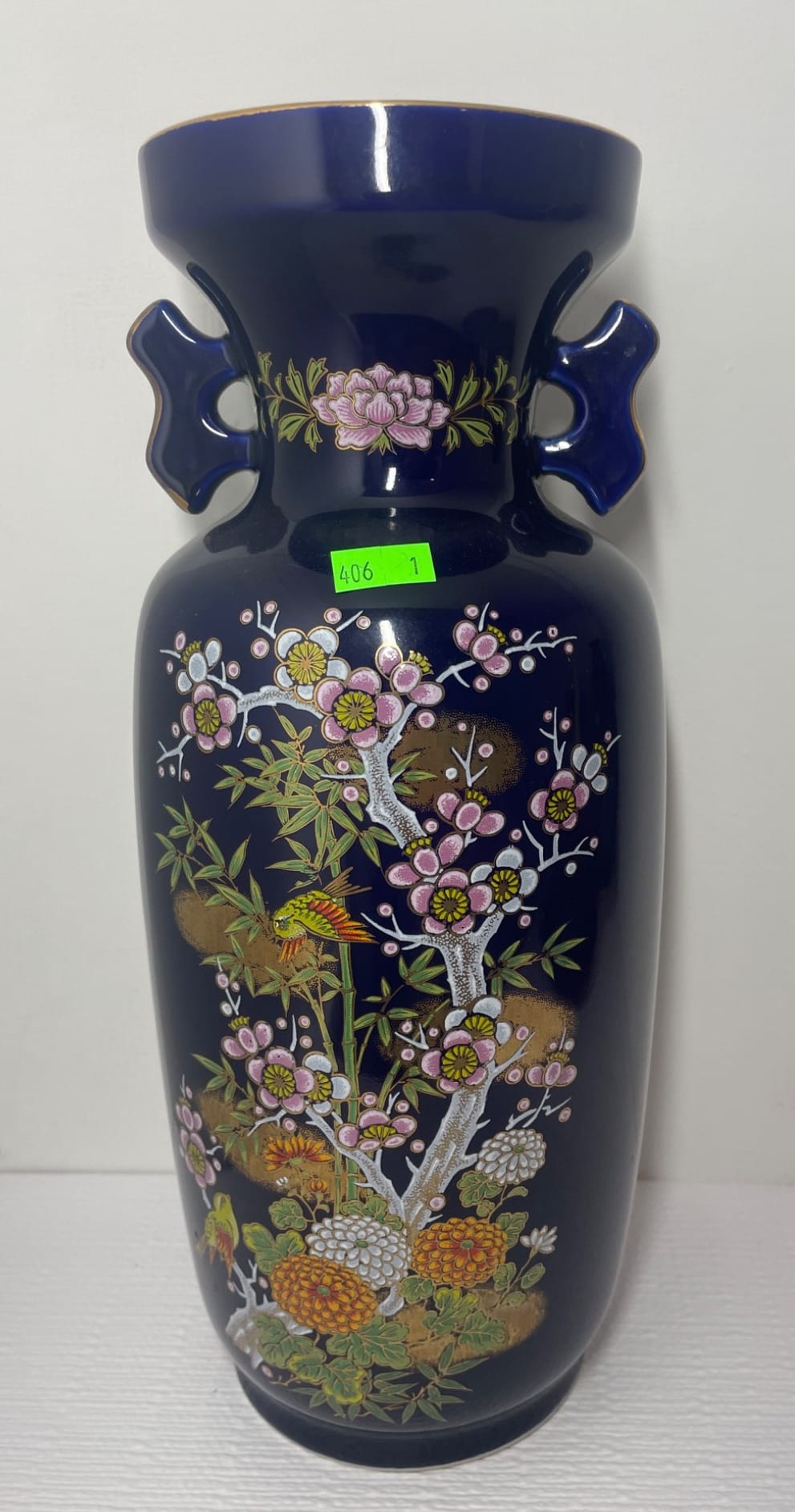406 Cobalt Blue Vase with Hand-Painted Floral and Tree Design 12”