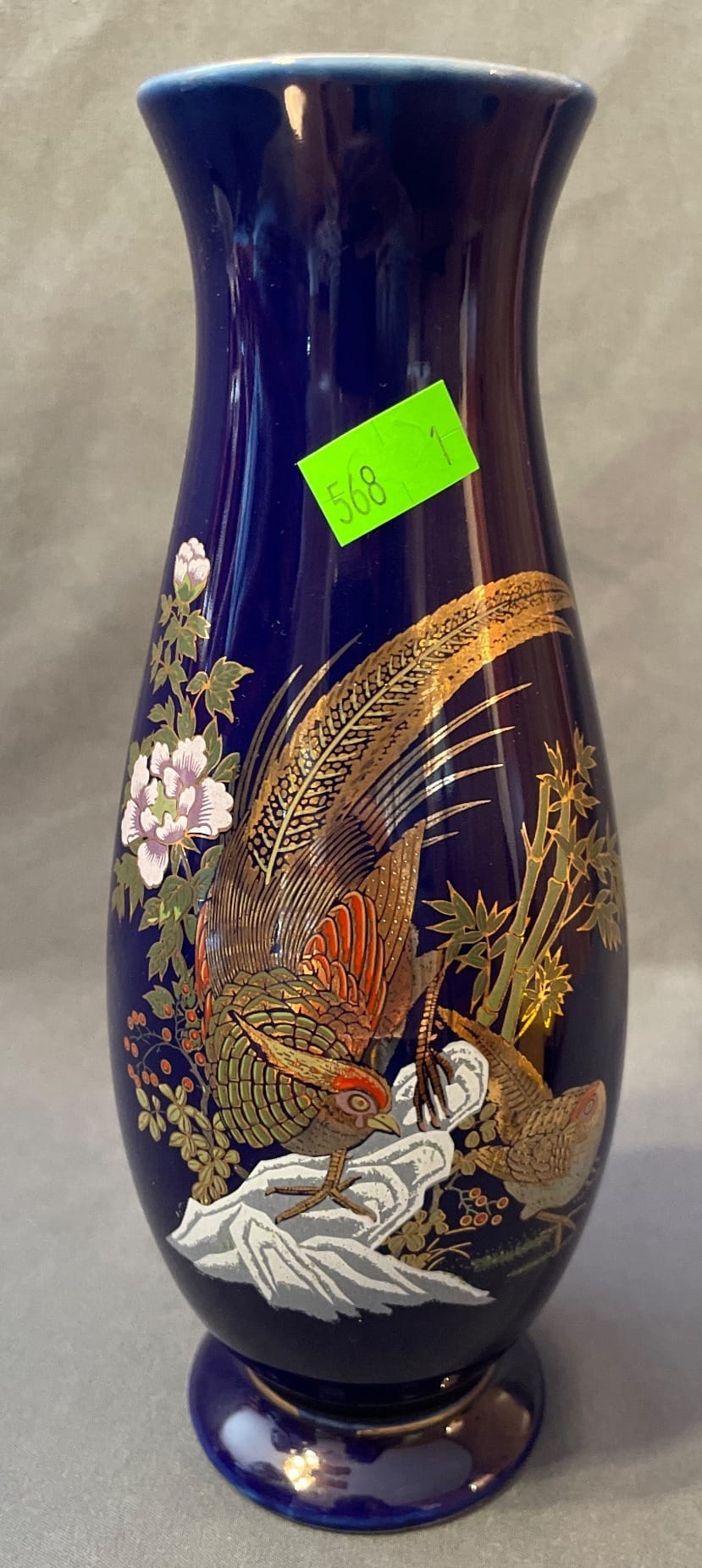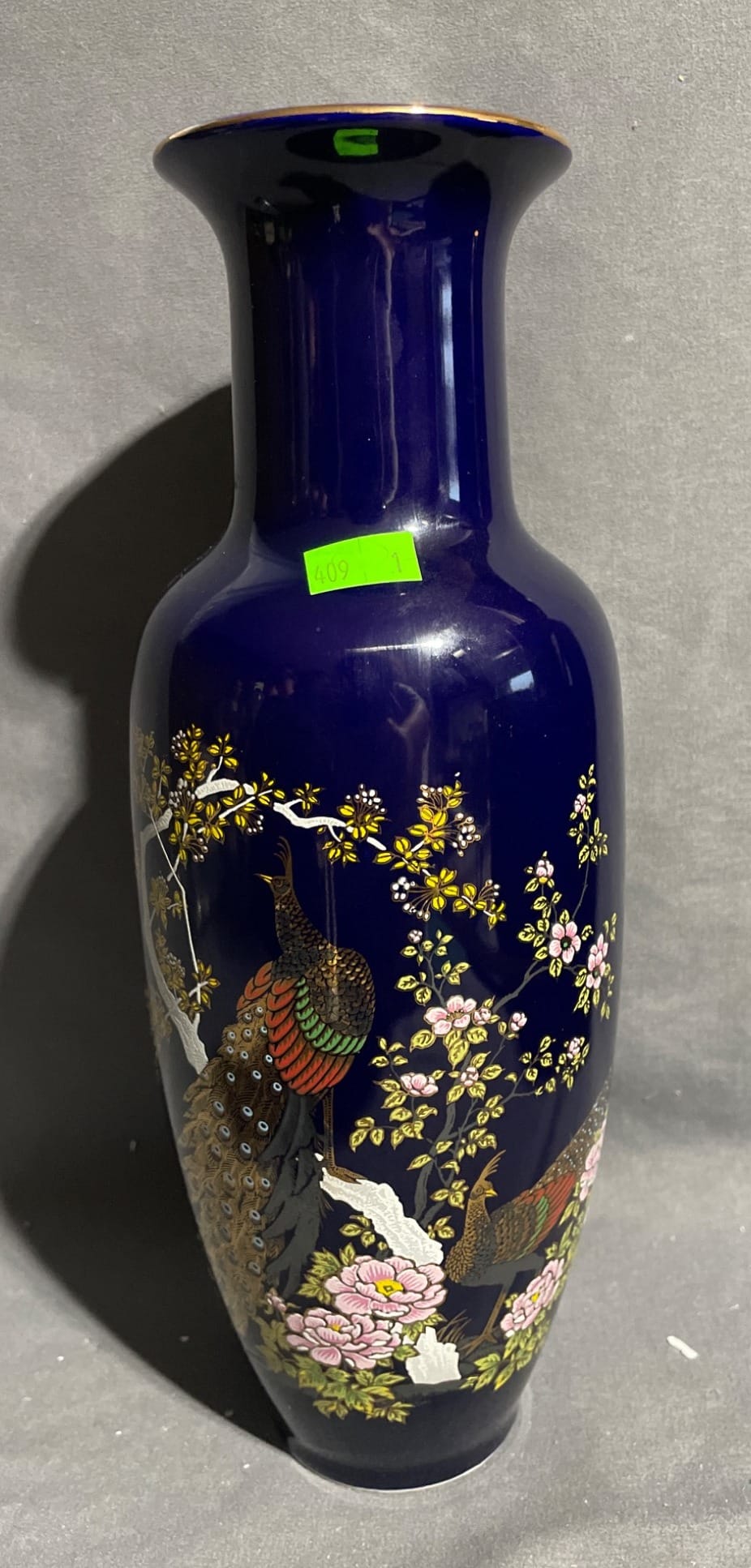 409 Cobalt Blue Vase with Peacock and Floral Design 11”
