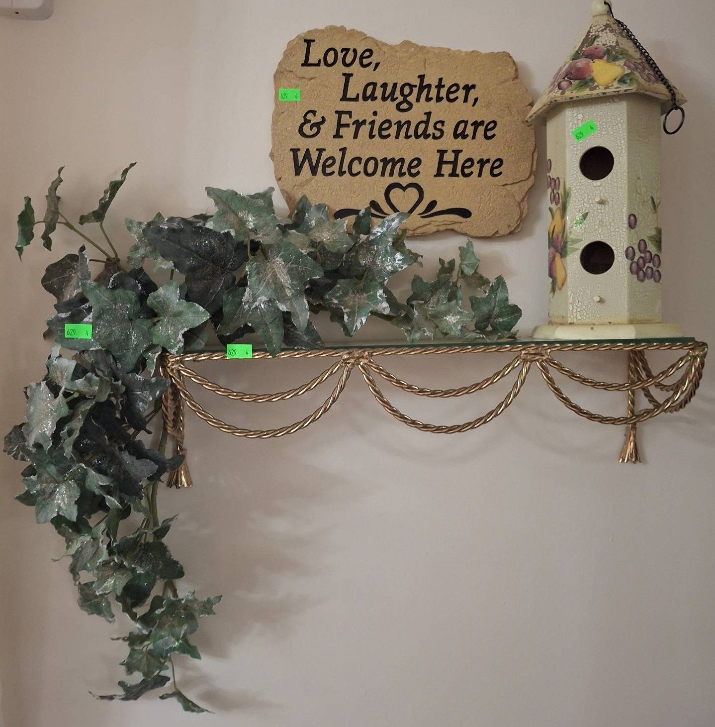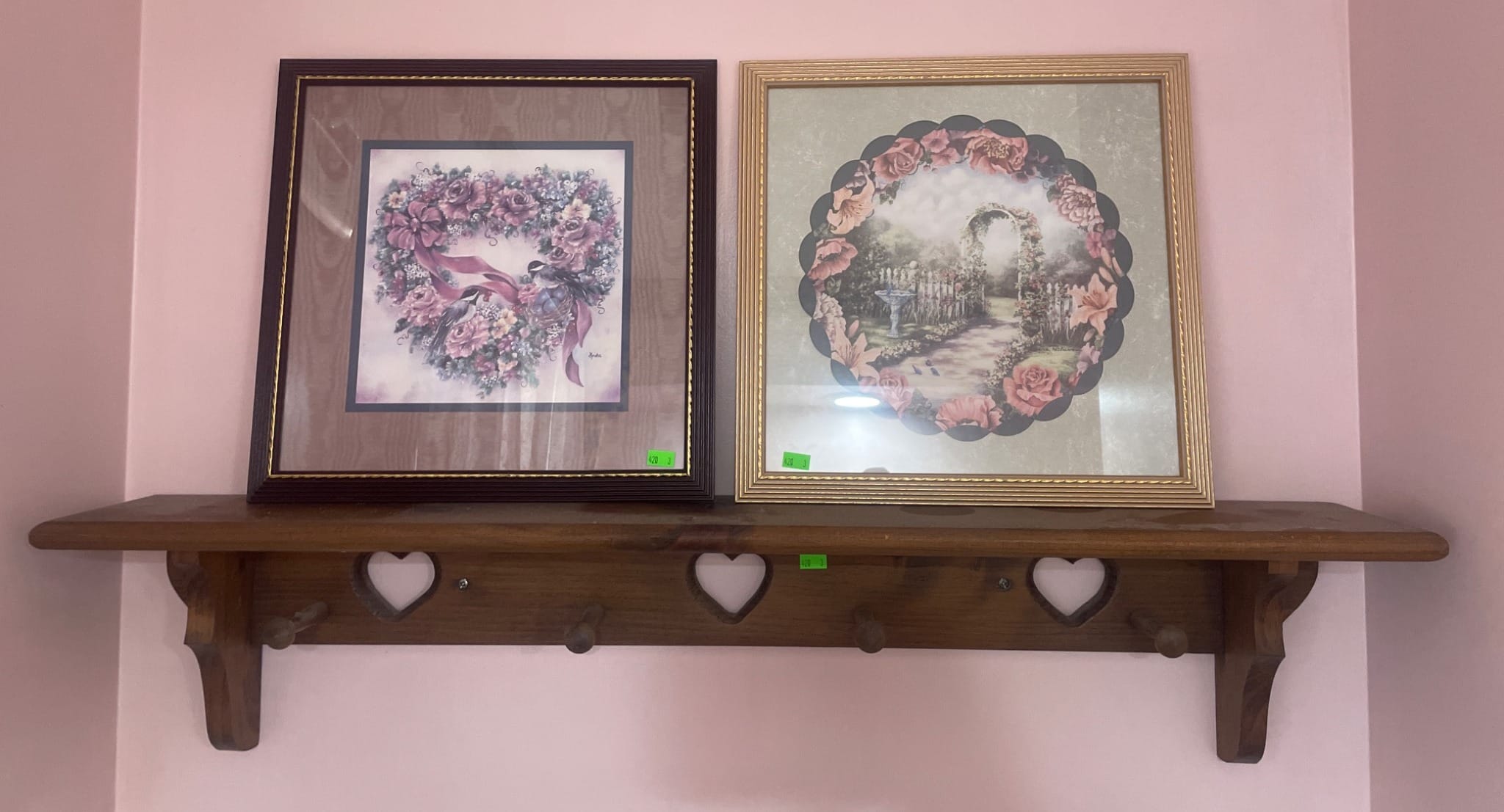 420 Wall Shelf with Heart Cutouts and 2 Framed Floral Prints by Home Interiors & Gifts 14”x14”, 36”x5”x7”