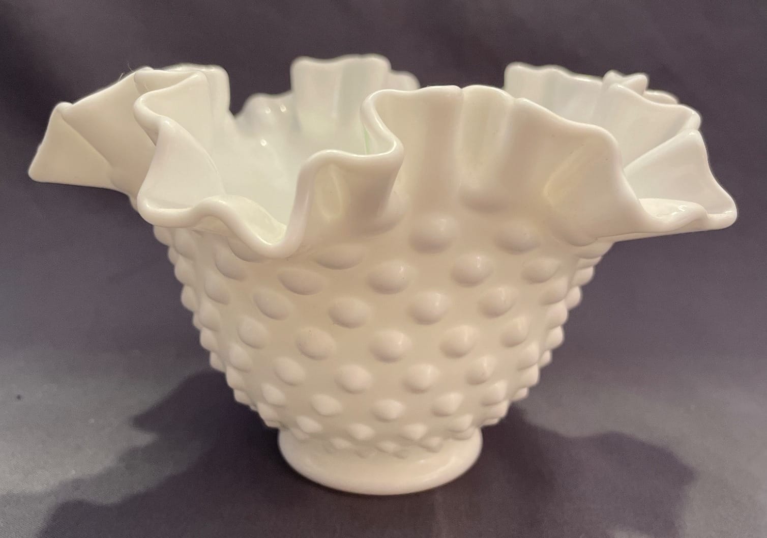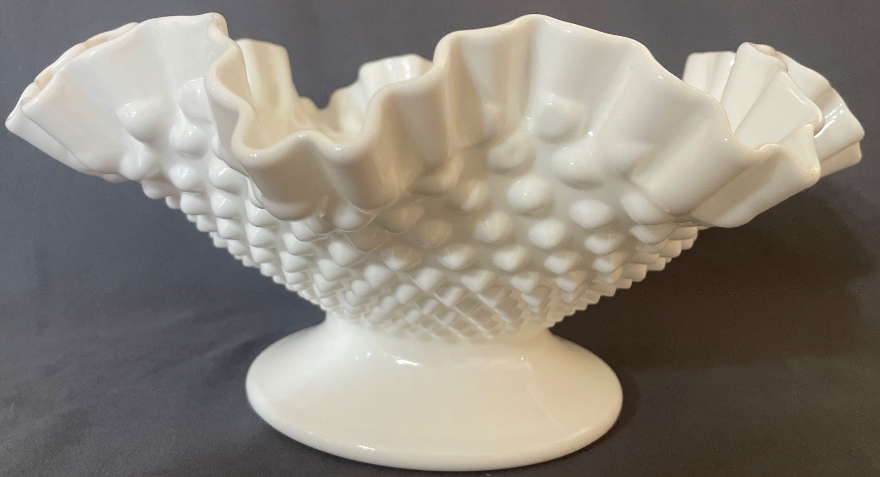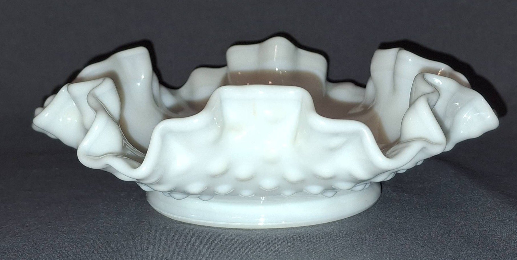 506 Fenton Hobnail Milk Glass Ruffled Edge Bowl, 4×6.5?