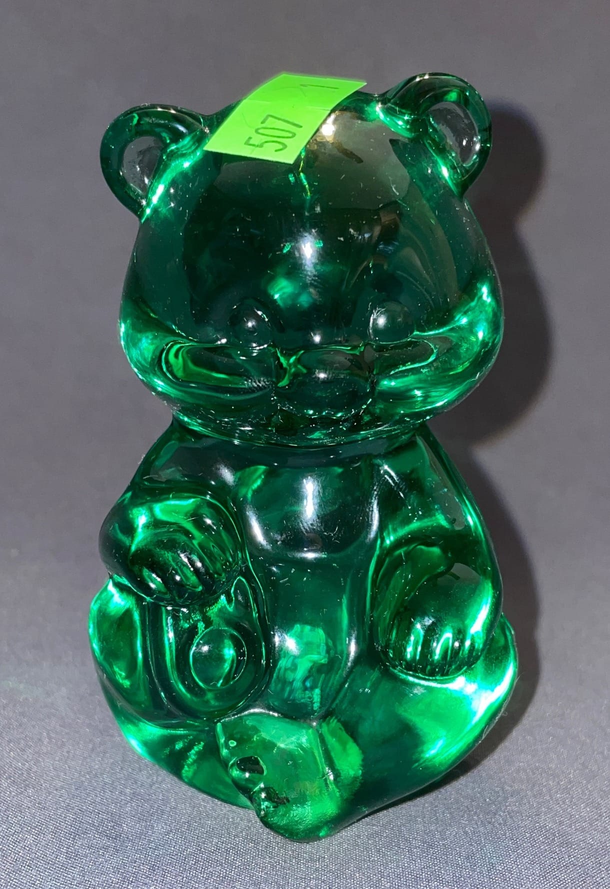 507 Fenton Art Glass Light Green Sitting Bear, 3.5”H