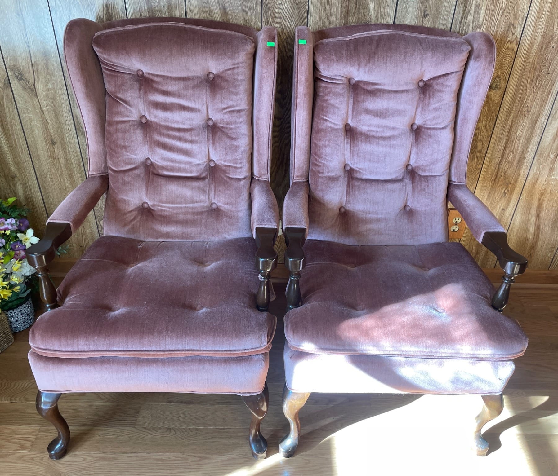 510 Wingback Chairs with Pink Upholstery and Carved Wood Legs 24”x25”x39”