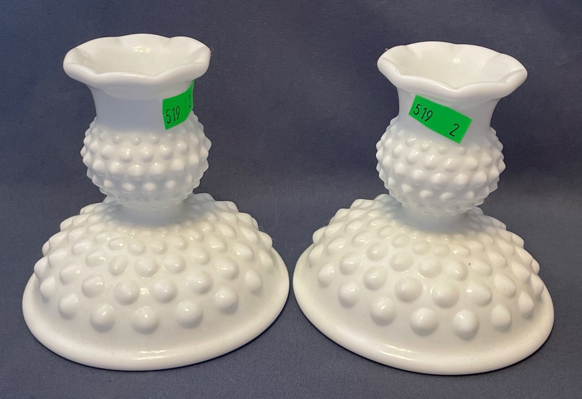519 2 Fenton Milk Glass Candle Holders with Hobnail Pattern 4”