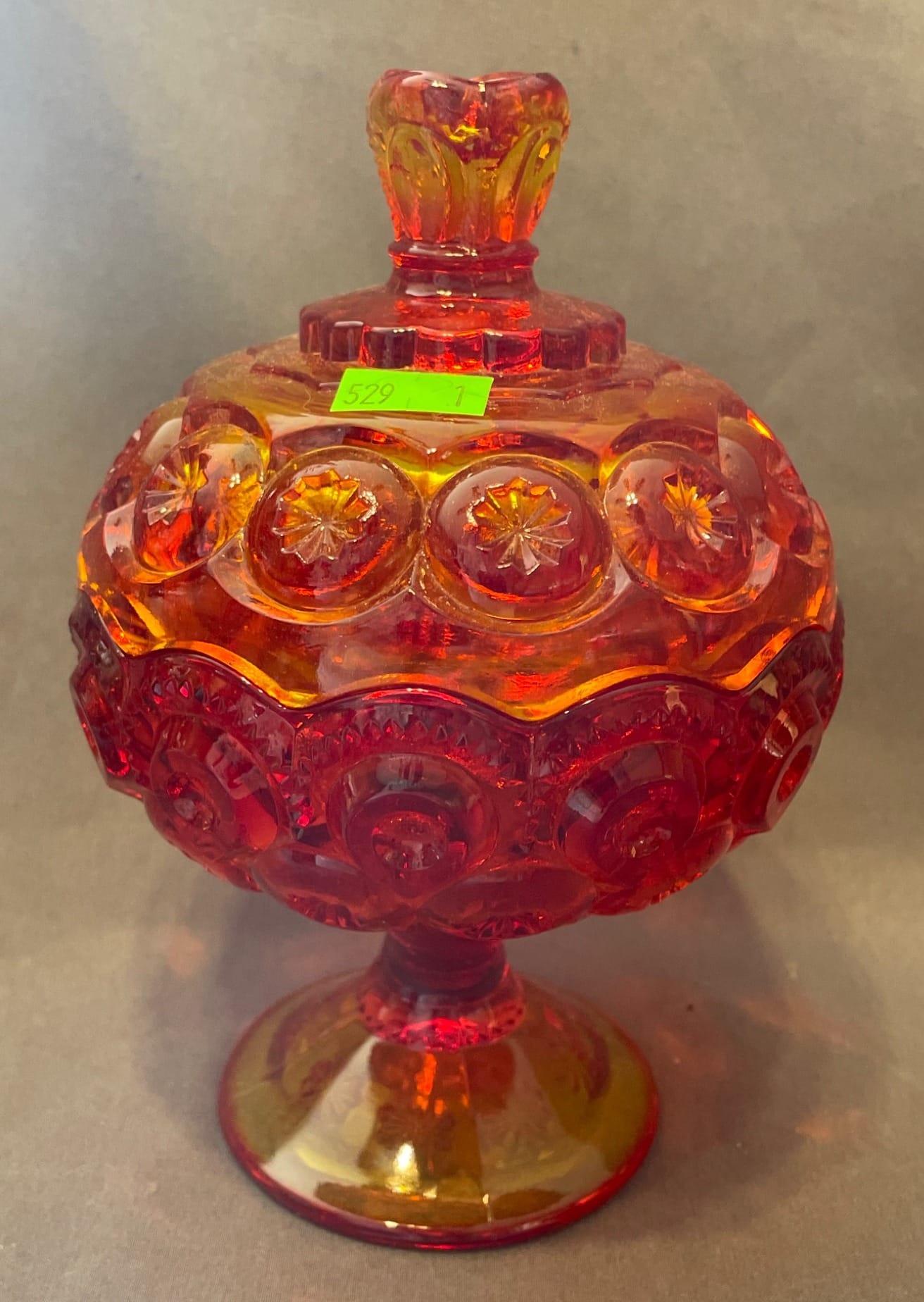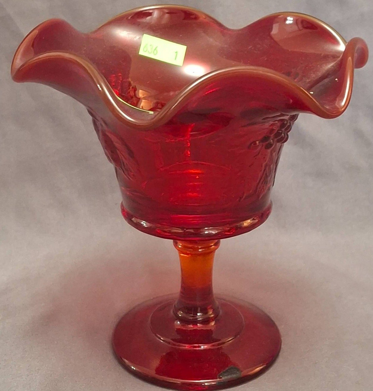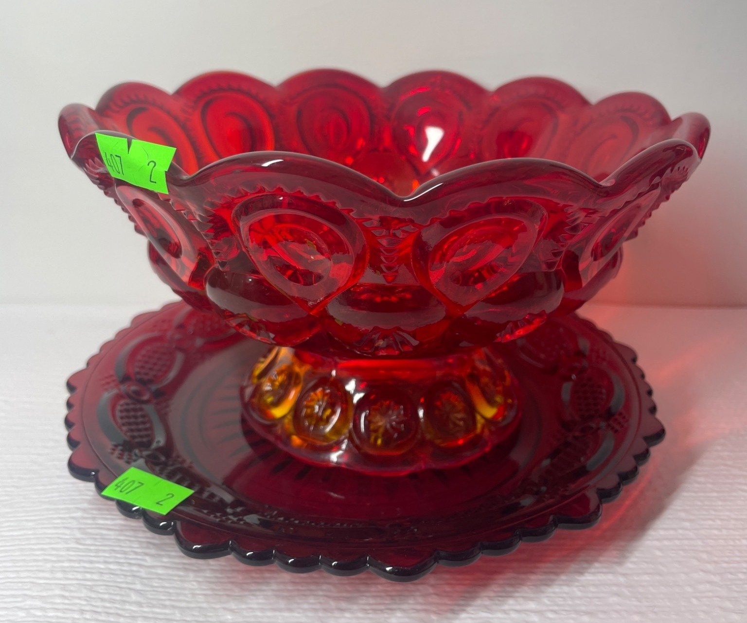 407 Red Carnival Glass Thumbprint Compote and Plate 7.5”