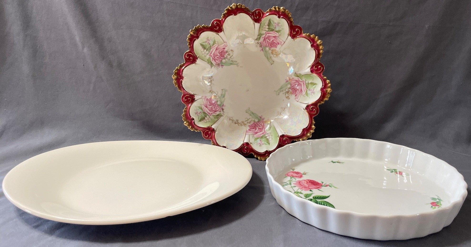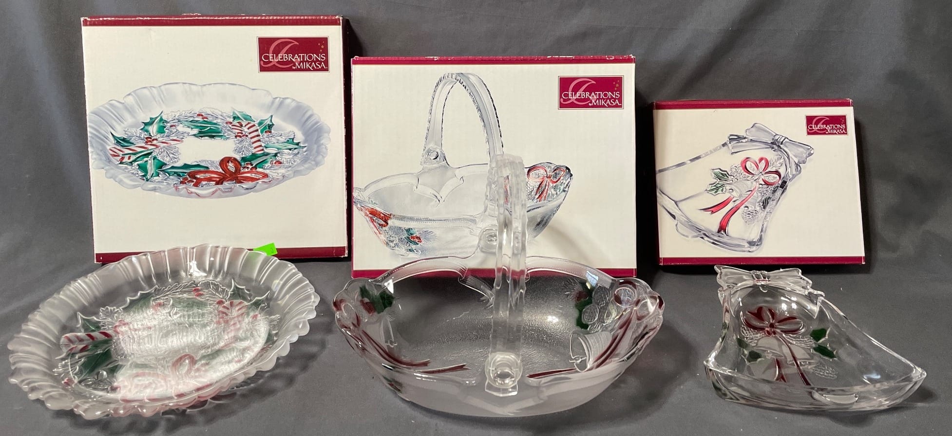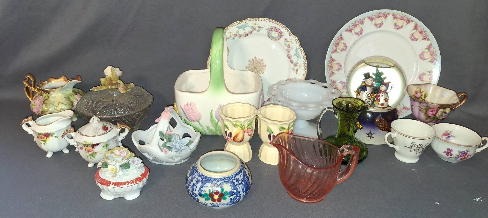 218 Porcelain Tableware and Glassware with Floral and Holiday Motifs Inc. Snowglobe, Ceramic Baskets, Compote, Teacups, Plates, Etc.