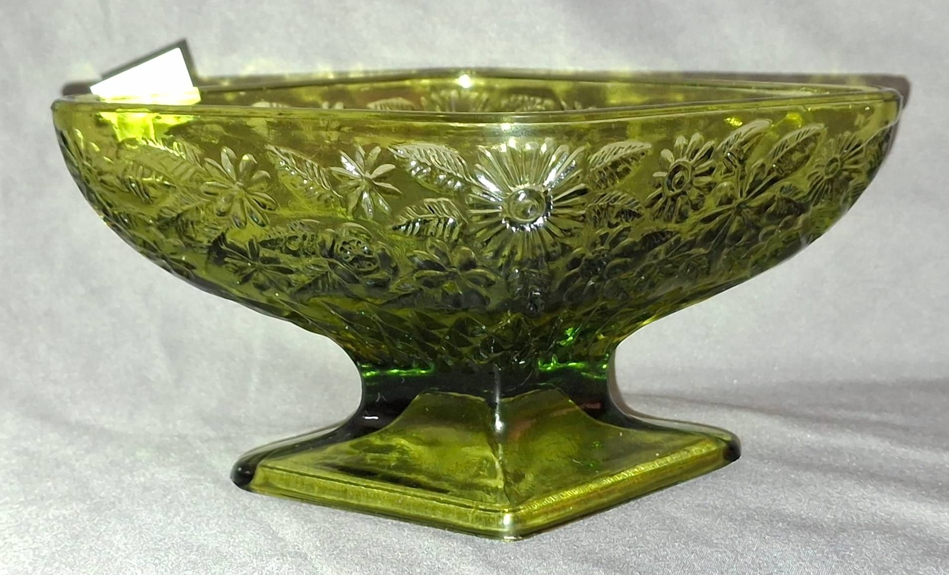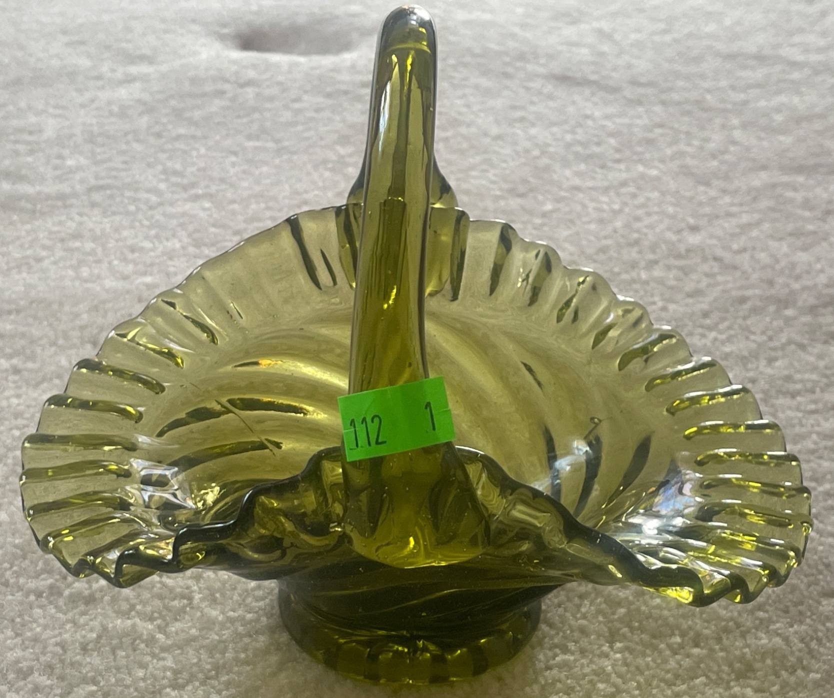 112 Unmarked Fenton Green Avocado Glass Basket with Ruffled Rim and Twisted Handle 6.5”x6”x6.5”