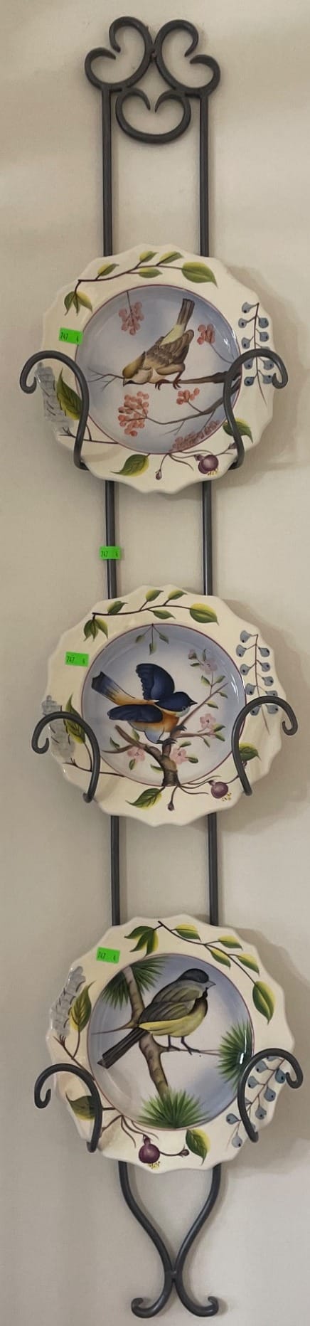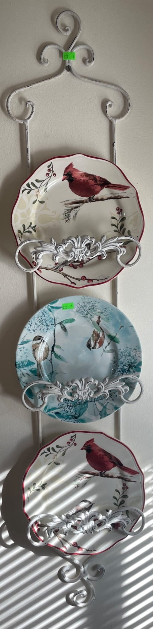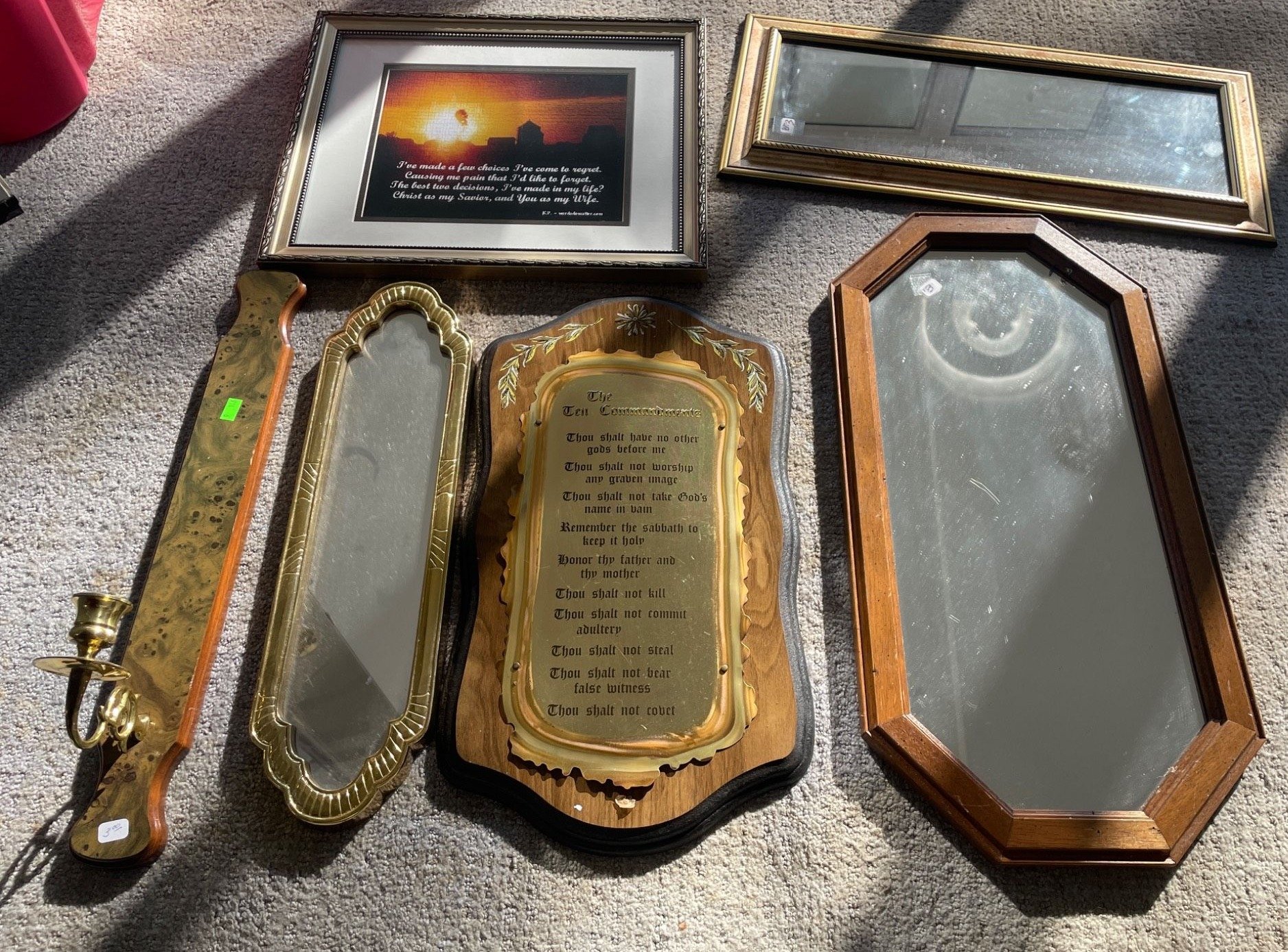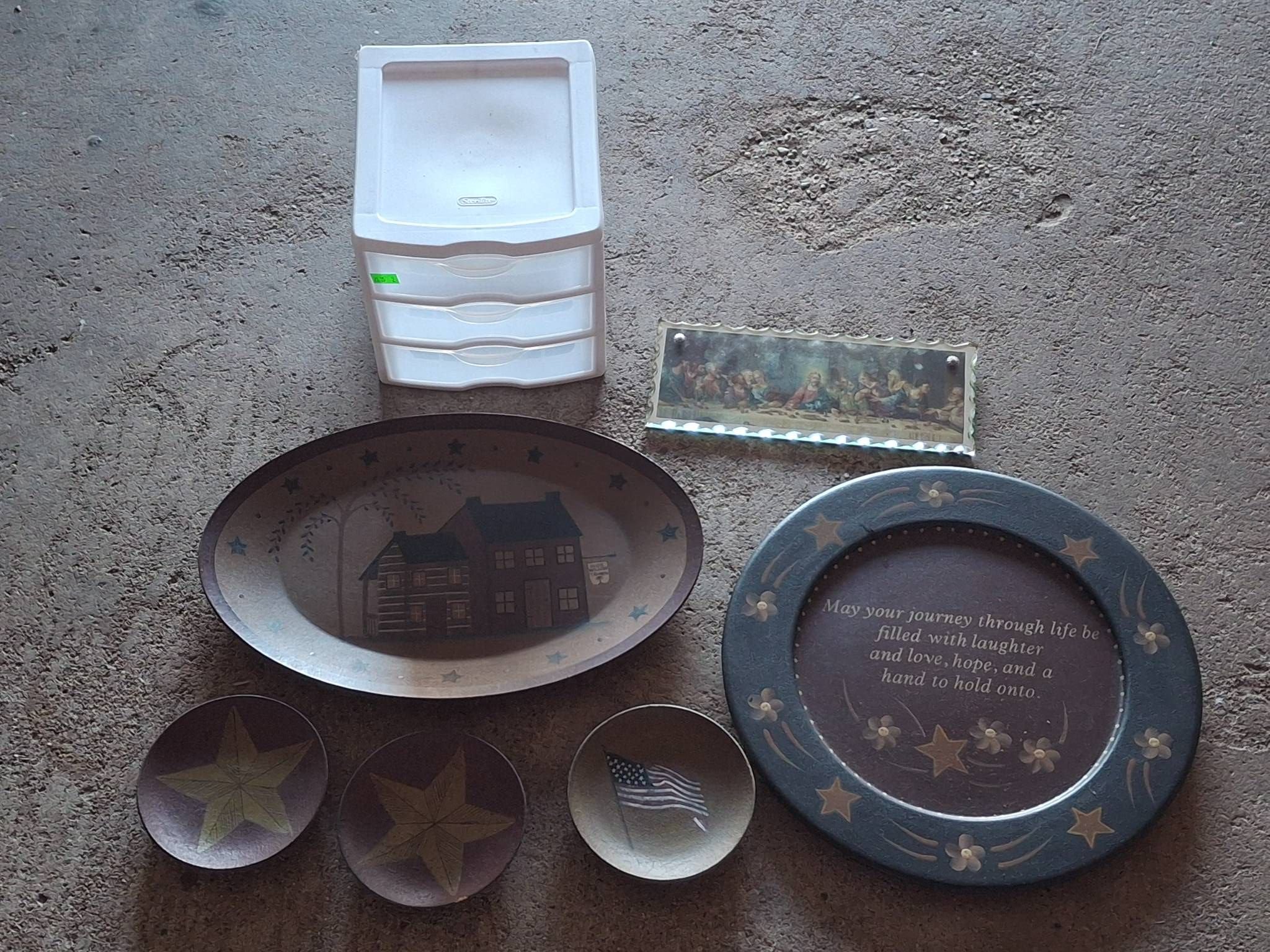 2015 Decorative Plates, Mirror with Religious Artwork, and Plastic Drawer Unit 5?-13?