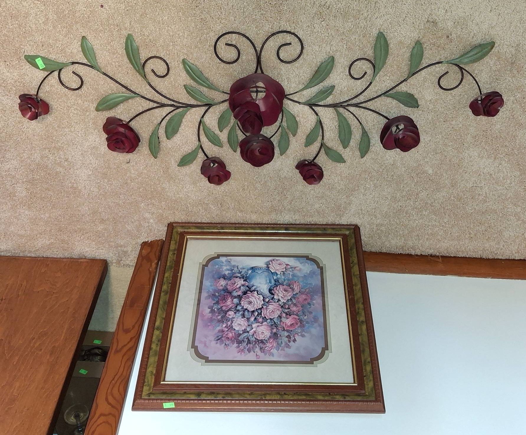201 Framed Floral Artwork by Julia Granner and Metal Wall Sculpture with Roses 18?x19? & 36? Lgth.