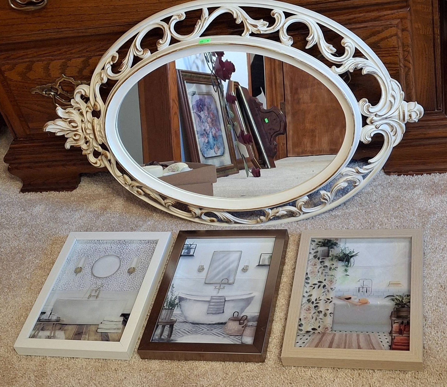205 Ornate Oval Mirror with 3 – Framed Interior Bathroom Themed Art Prints 8.5?x11? & 28? Lgth.