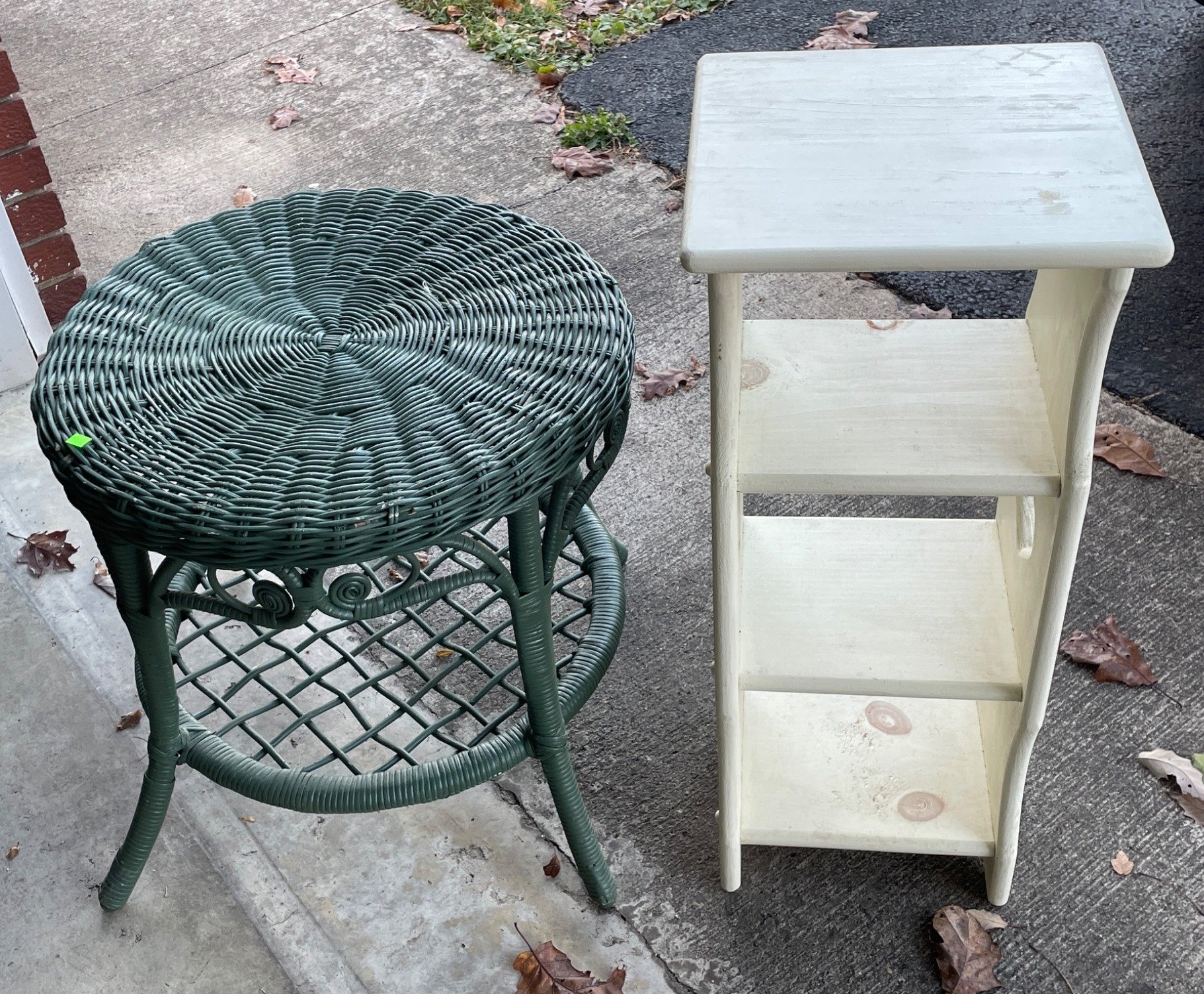 2077 Green Wicker Round Side Table and White Wooden 3-Shelf Stand 20”x20”, 12”x11”x30”