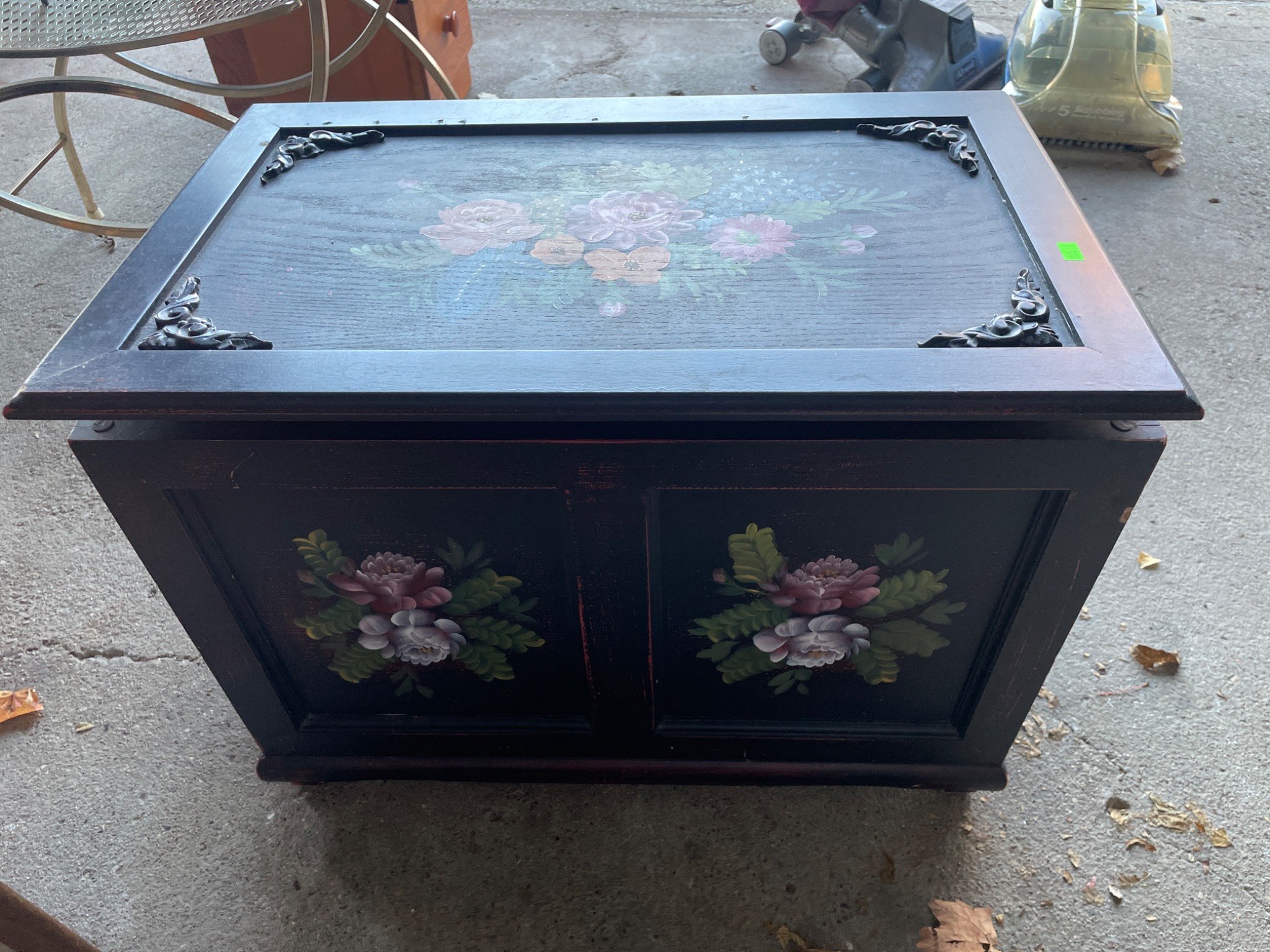 2085 Black Storage Chest with Floral Painted Panels and Hinged Lid 23.5”x15”x18”
