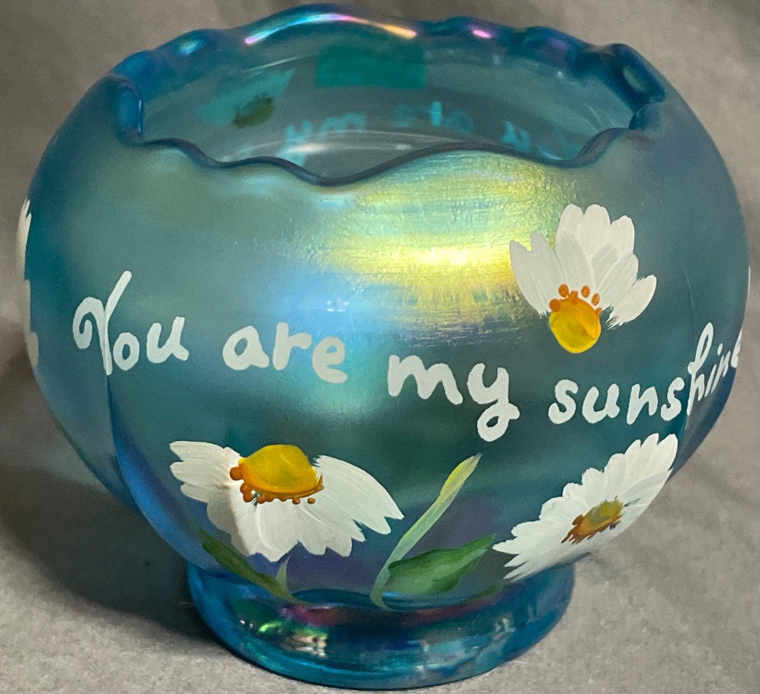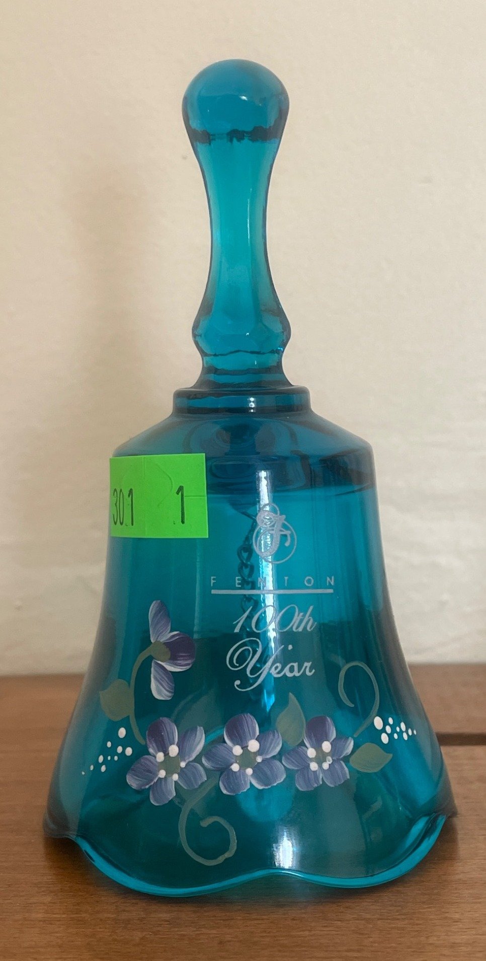 301 Fenton Art Glass Hand-Painted Blue Bell with 100th Year Logo, 6”