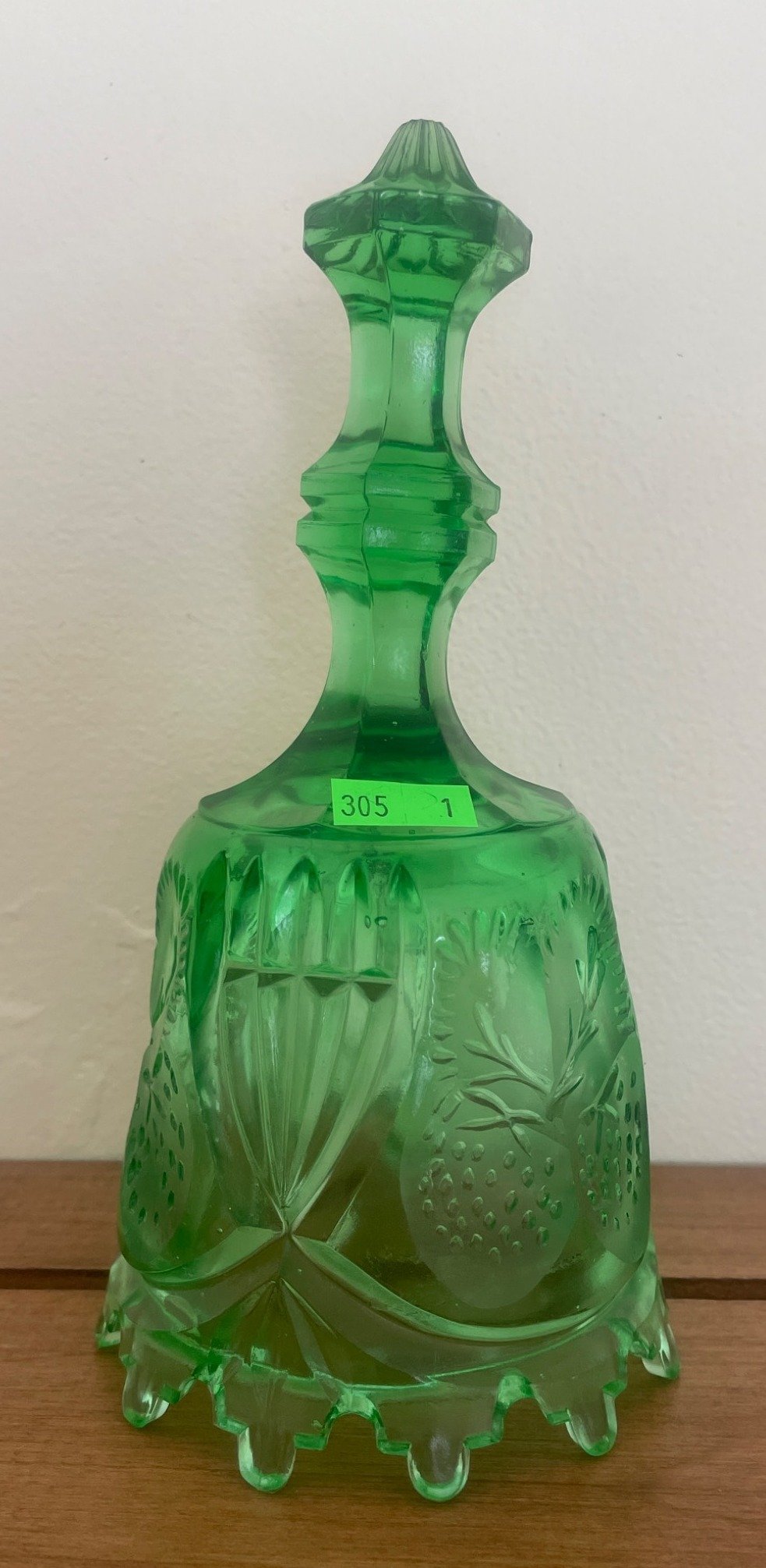 305 Green Pressed Glass Bell with Etched Floral and Berry Motif 8”