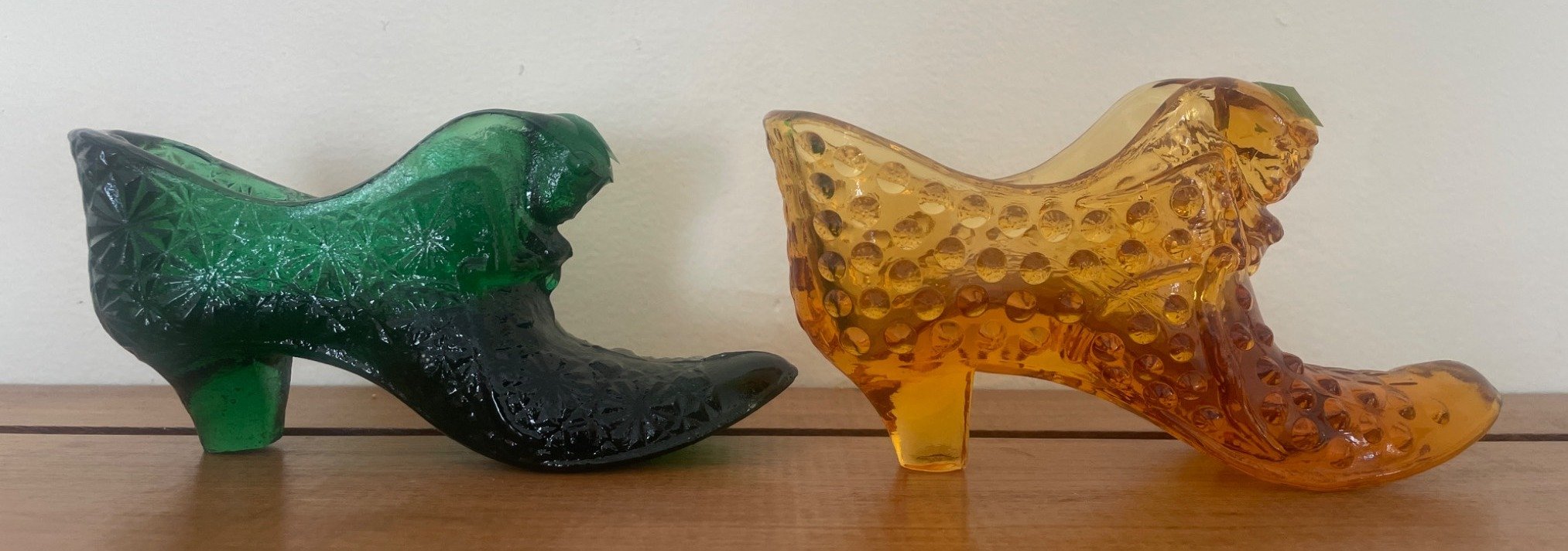307 Fenton Emerald Green Glass Slipper and Fenton Hobnail Amber Glass Slipper, 6”