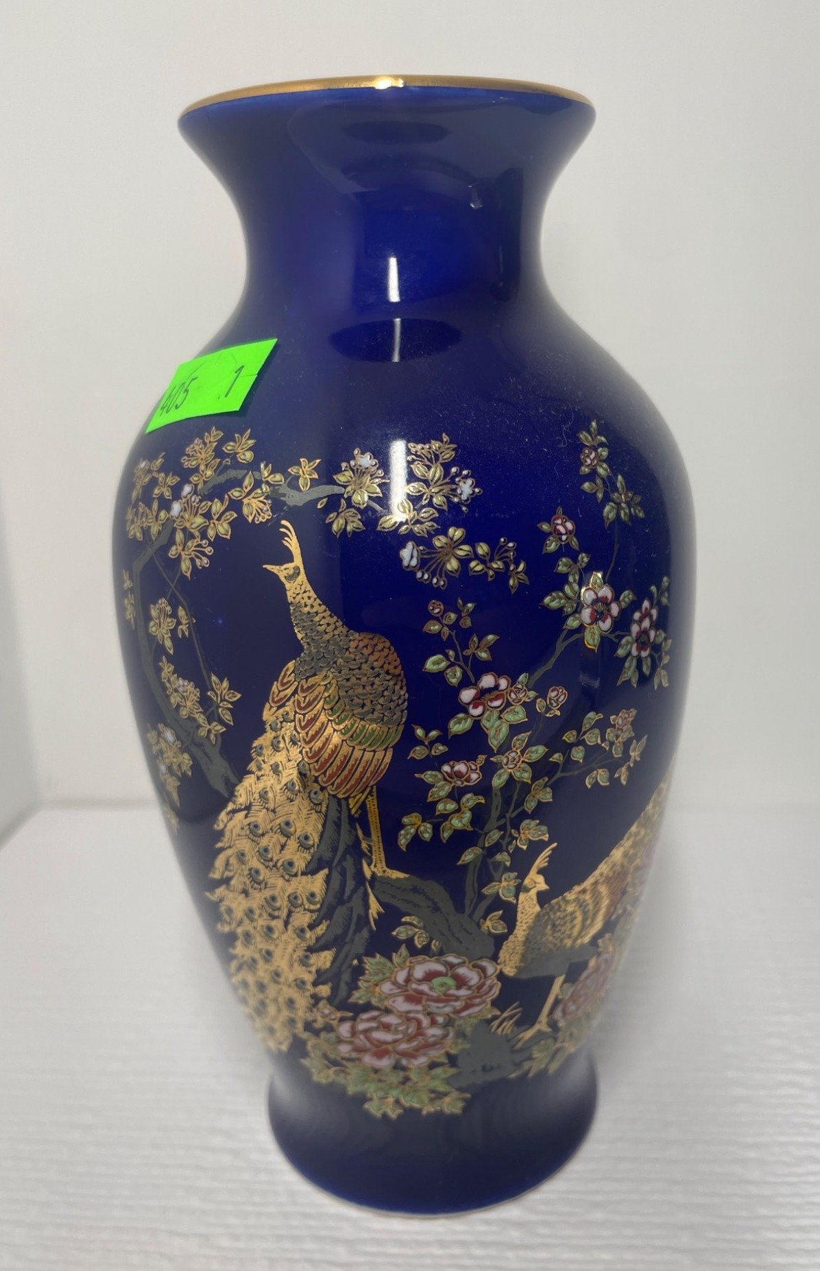 405 Cobalt Blue Vase with Gold-Tone Accents and Peacock Motif 6.5”