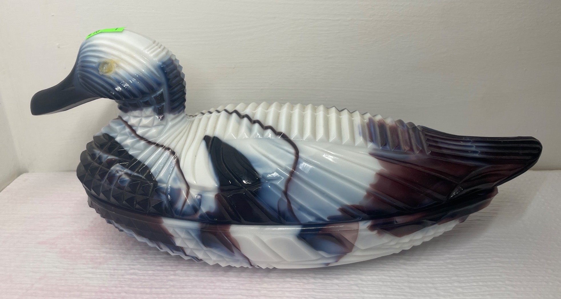 410 Amethyst Slag Glass Covered Duck Dish, 11”x6”