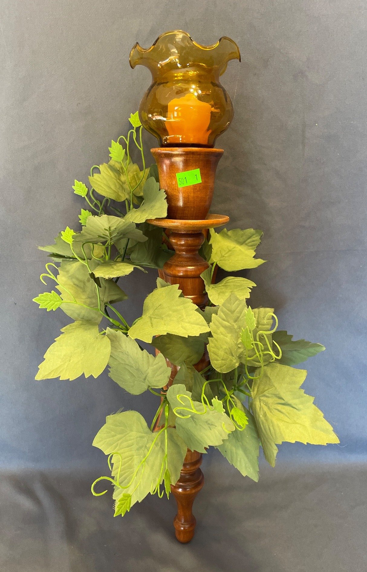 501 Wall-Mounted Candle Holder with Amber Glass Shade and Faux Greenery, 18”L