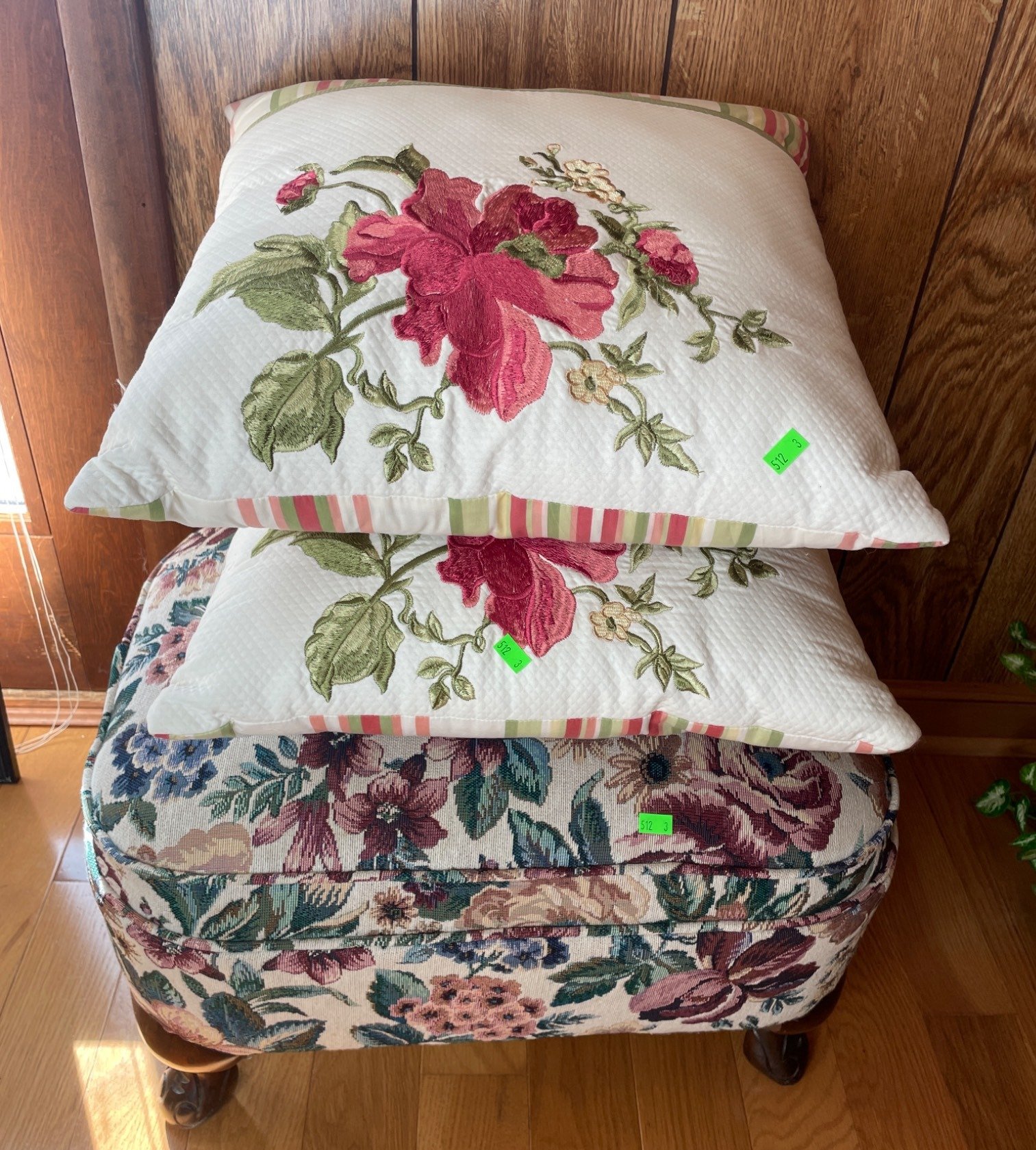 512 Floral Upholstered Ottoman and 2 Embroidered Throw Pillows 20”x16”x11”, 16”x16”