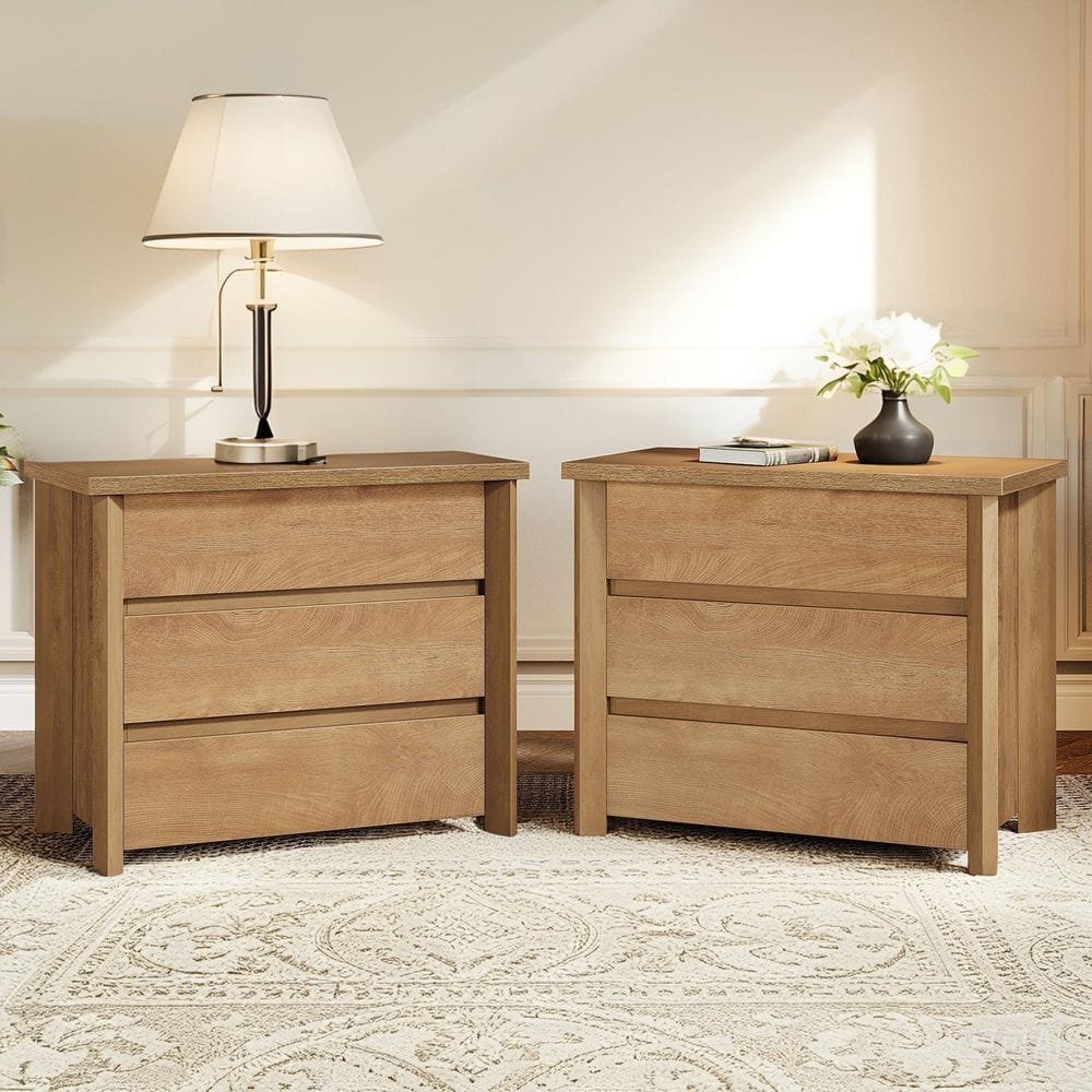601034 BYBLIGHT - Fenley Walnut 3-Drawer 31.5 in. W Wood Nightstands Set of 2, Farmhouse Bedside Table with Storage for Small Spaces