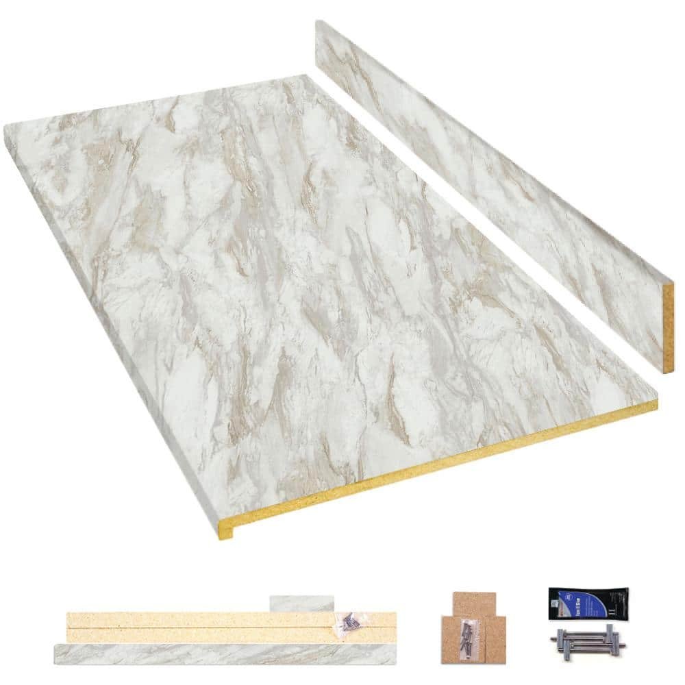 601039 HAMPTON BAY - 8 ft. Straight Laminate Countertop All-Inclusive Kit in Textured Drama Marble with Eased Edge and Loose Backsplash