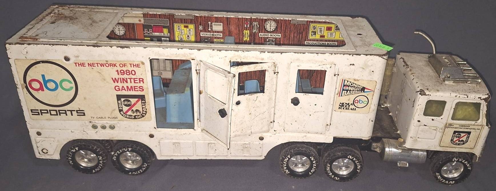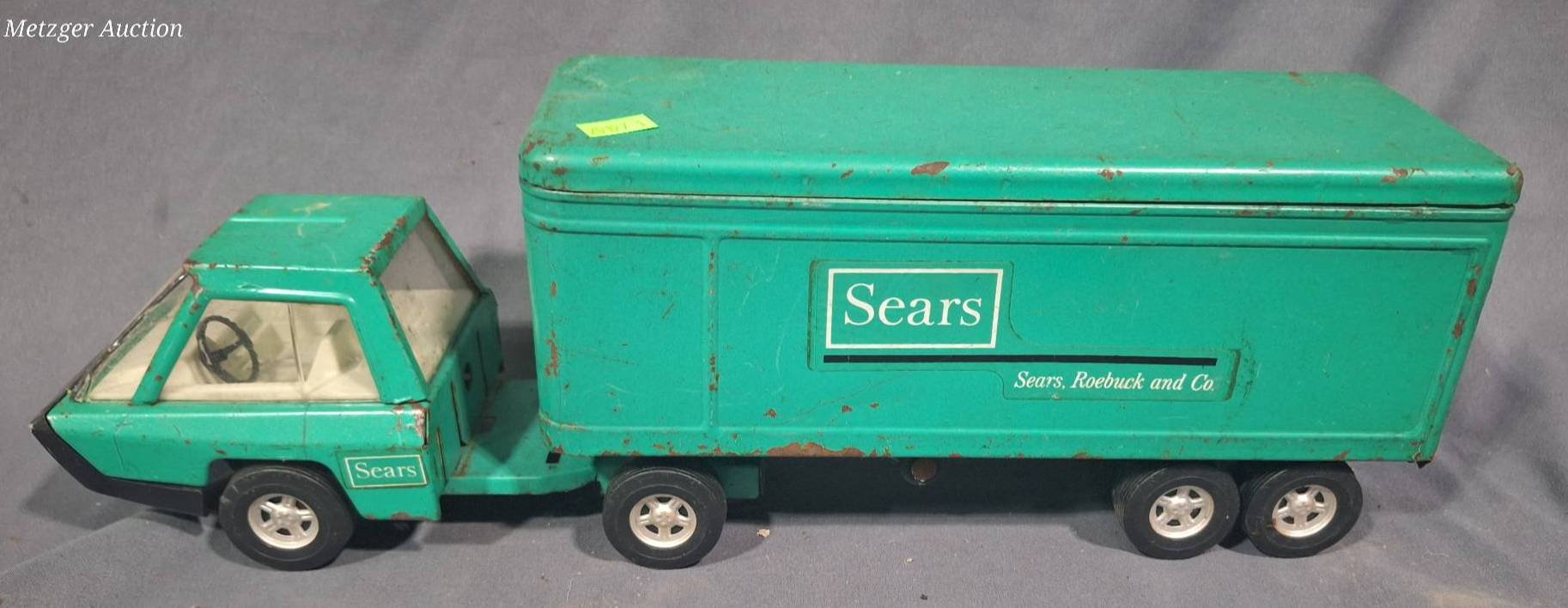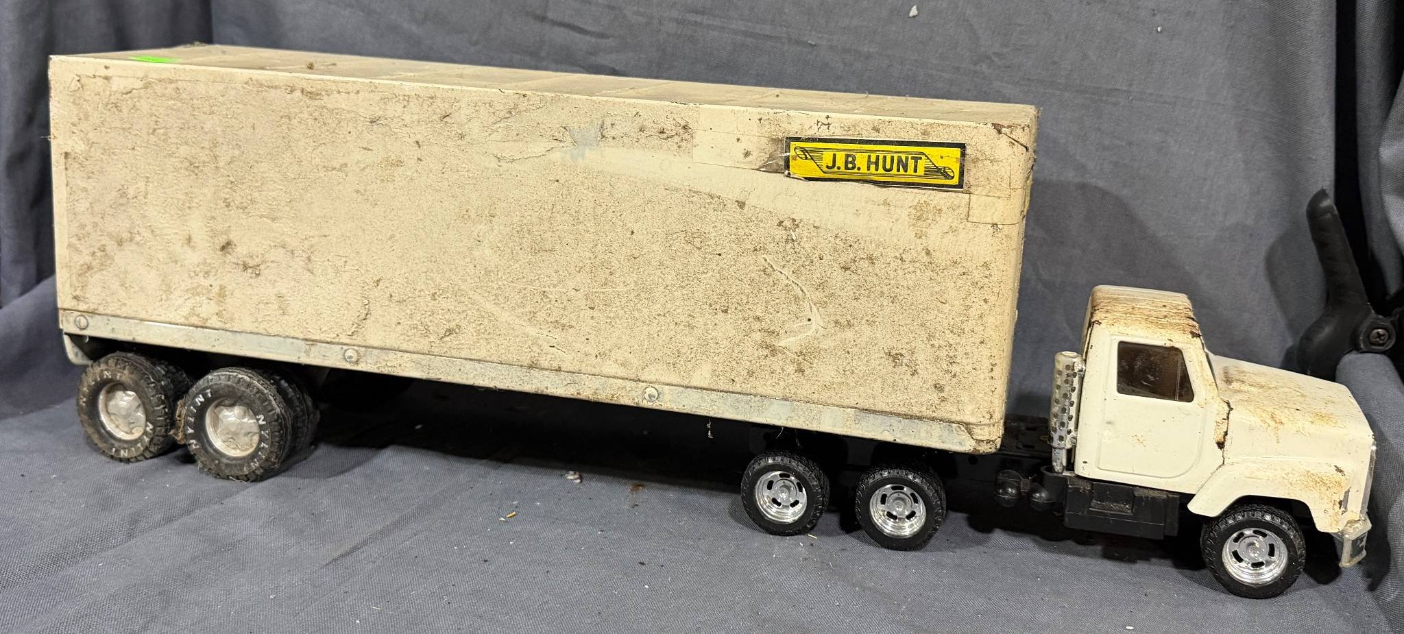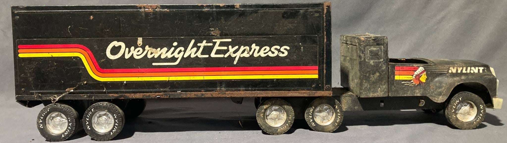 20048 Nylint Overnight Express Pressed Steel Semi Truck and Trailer: Truck, 14”x5”x5.5” Trailer, 17.75”x5.57”x8.25”(cab of truck missing, minor damage)