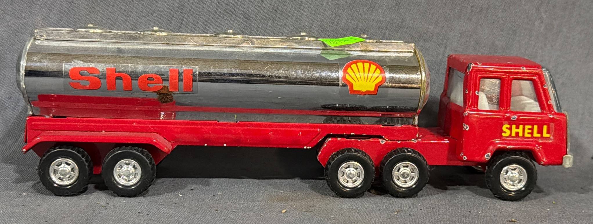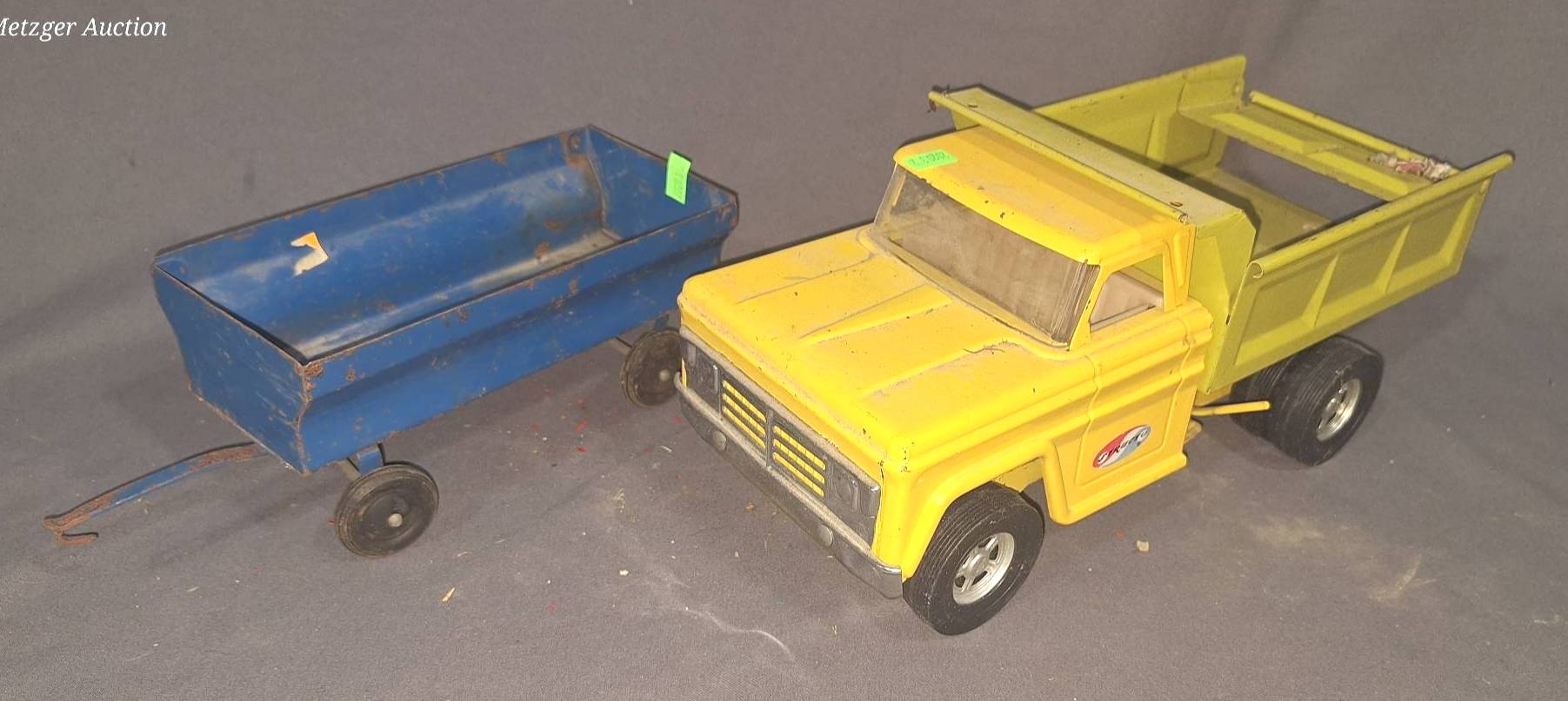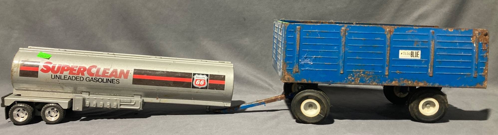20047 Metal Toy Superclean Gasoline Tanker Trailer and Blue Hauling Wagon: Tanker, 14”x3.5”x4.5” Wagon, 16.5”x7”x6.25”(damage to axle & sides)