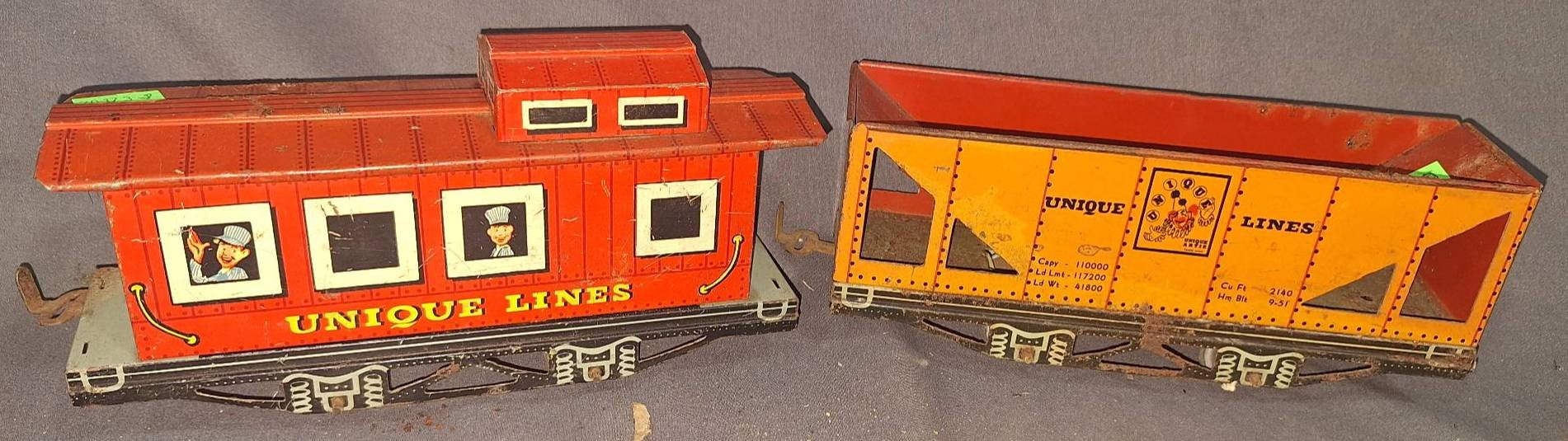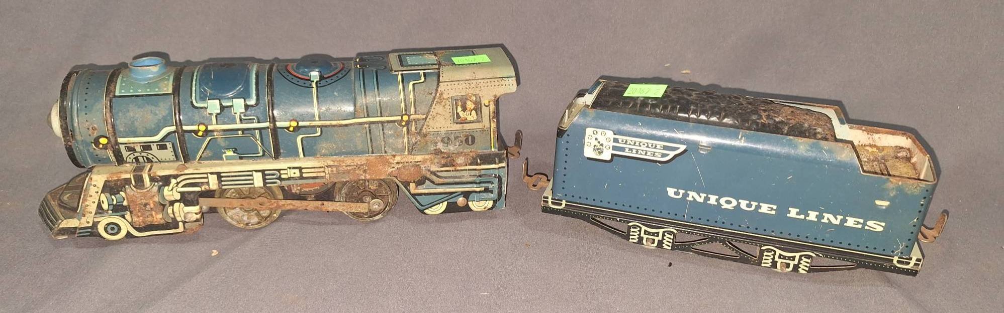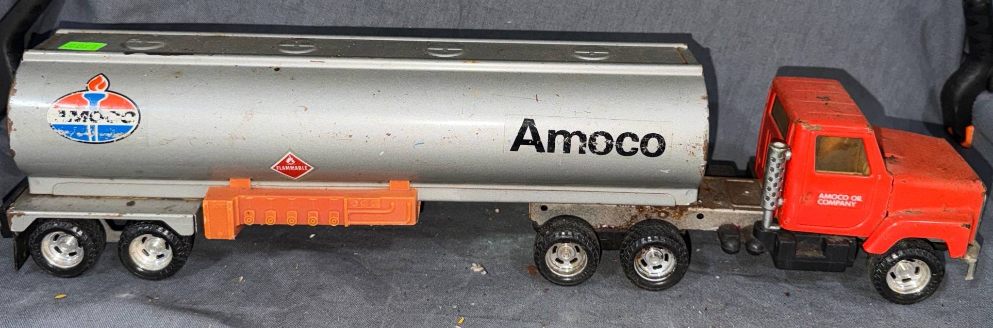 20047 Metal Toy Superclean Gasoline Tanker Trailer and Blue Hauling Wagon: Tanker, 14”x3.5”x4.5” Wagon, 16.5”x7”x6.25”(damage to axle & sides)
