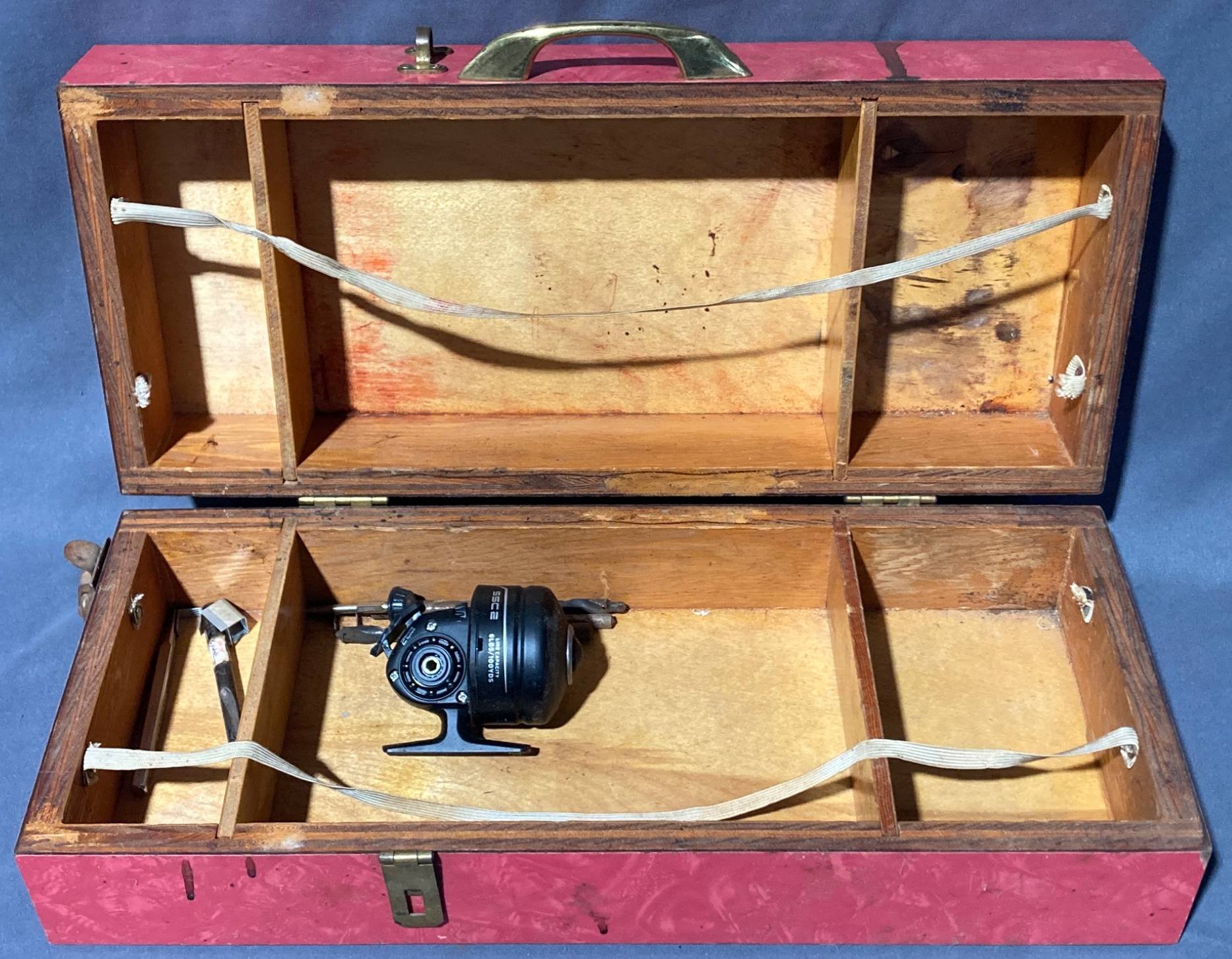 20052 Red Hinged Storage Box With Brass Hardware and Interior Compartments with Shakespeare Reel, 16.5”x7”x4.5”